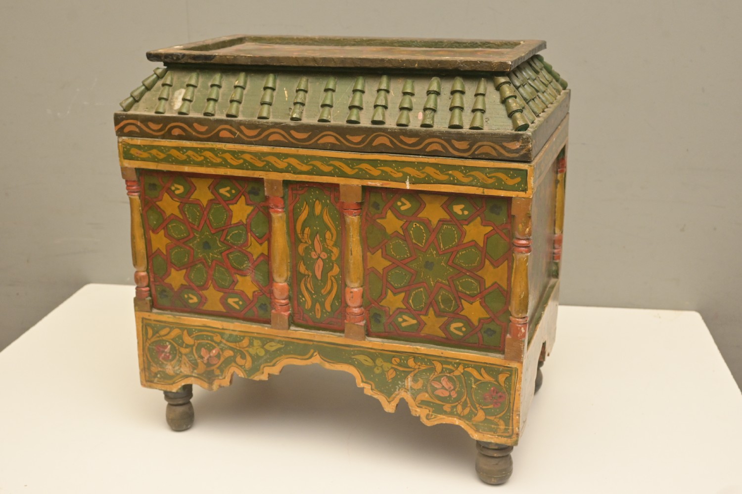 A HAND PAINTED DECORATIVE FLIP TOP CHEST (A/F) (55H X 53W X 33D CM) (LEONARD JOEL DELIVERY SIZE: MEDIUM)
