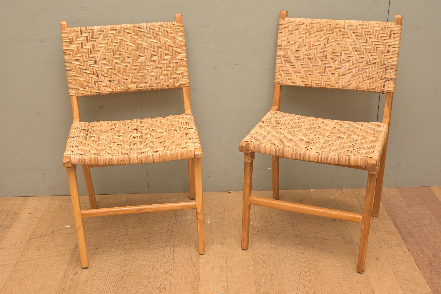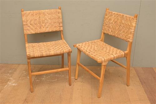 A PAIR OF MID-CENTURY STYLE TEAK AND RATTAN CHAIRS (89H X 51W X 54D CM) (LEONARD JOEL DELIVERY SIZE: LARGE)
