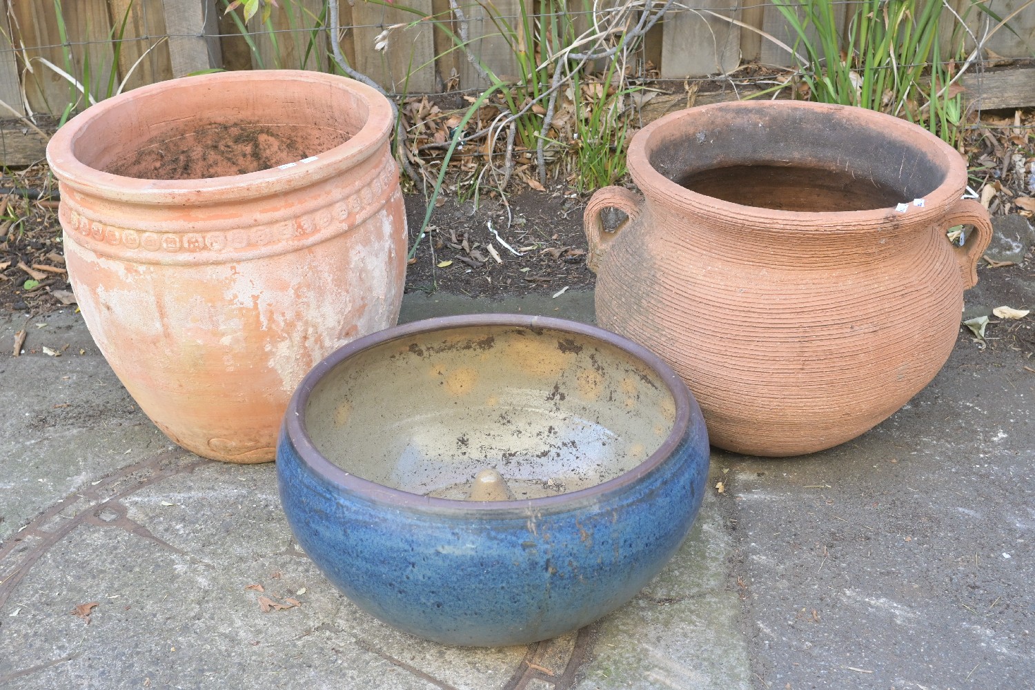 TWO LARGE TERRACOTTA POTS AND ONE BLUE POT (A/F) (47H X 47D CM) (PLEASE NOTE THIS HEAVY ITEM MUST BE REMOVED BY CARRIERS AT THE CUSTOMER'S EXPENSE. LEONARD JOEL STAFF CANNOT ASSIST CARRYING THIS ITEM) (X-LARGE ITEM)