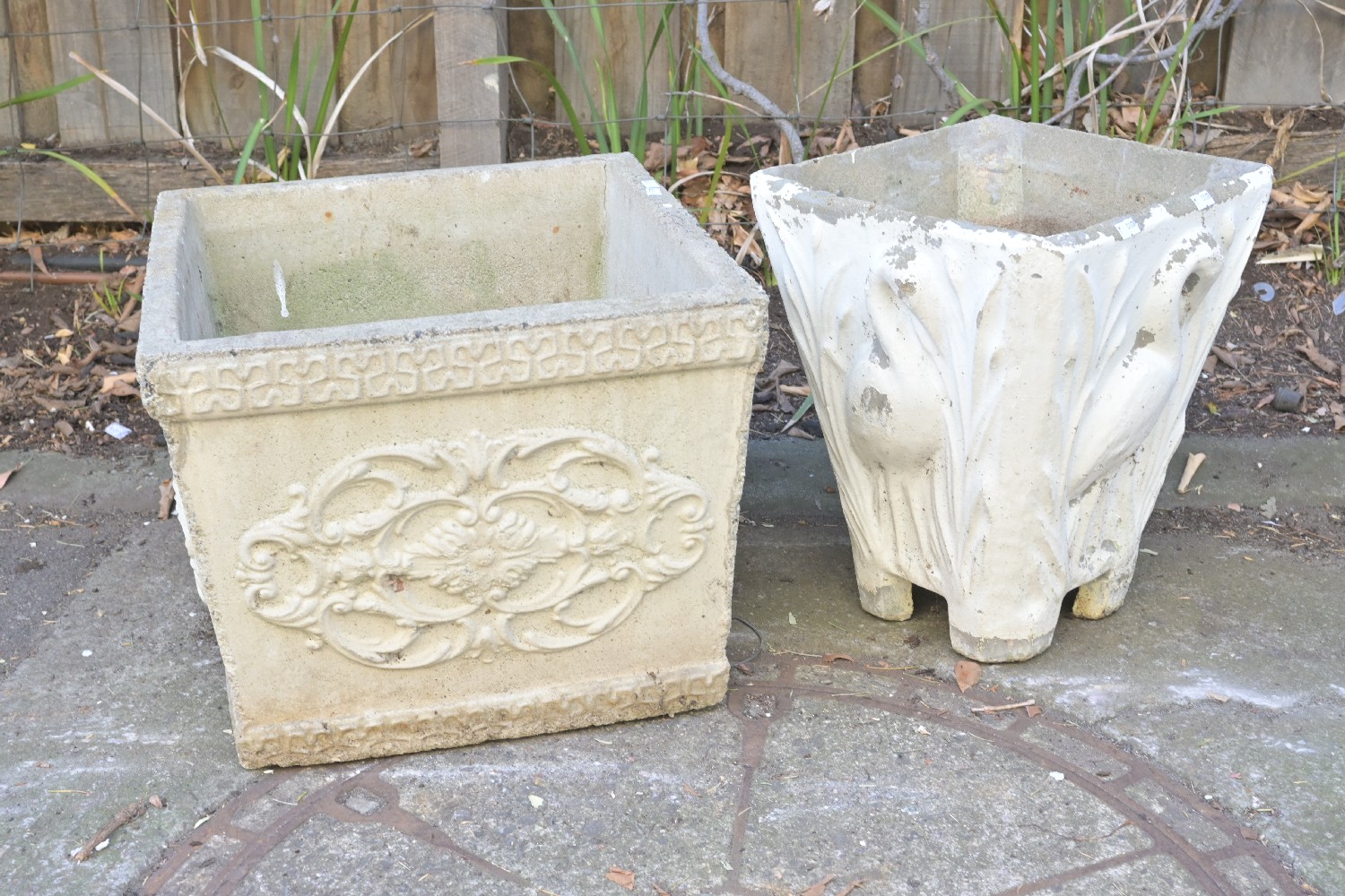 TWO VINTAGE CONCRETE POTS (A/F) (35H X 43W X 44D CM) (PLEASE NOTE THIS HEAVY ITEM MUST BE REMOVED BY CARRIERS AT THE CUSTOMER'S EXPENSE. LEONARD JOEL STAFF CANNOT ASSIST CARRYING THIS ITEM) (X-LARGE ITEM)