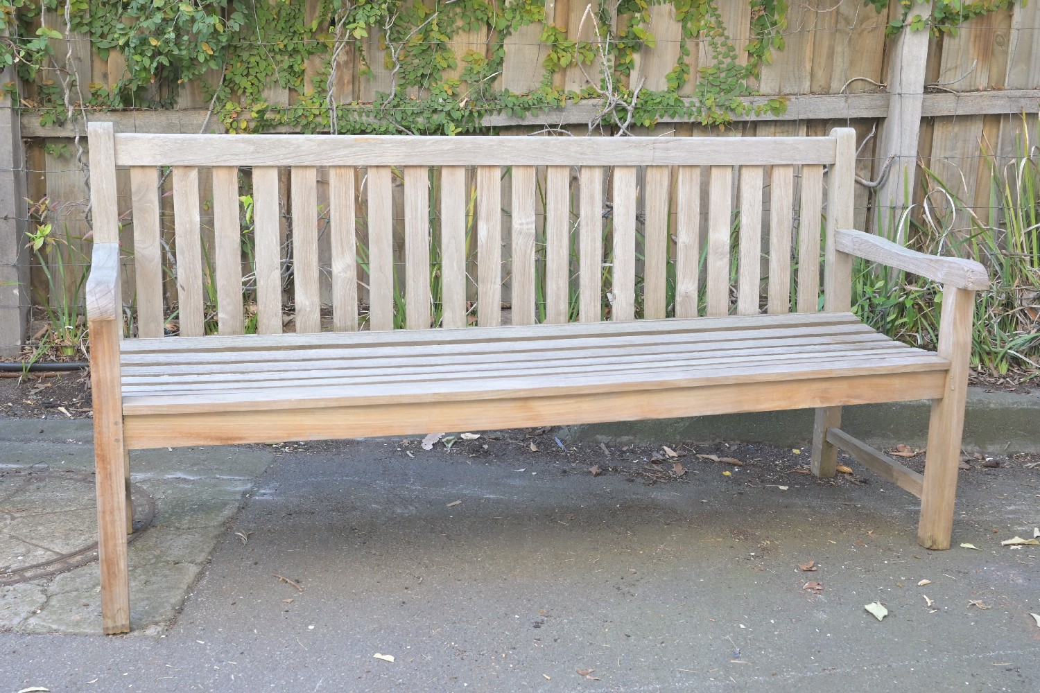 A LARGE TEAK OUTDOOR BENCH (A/F) (93H X 183W X 63D CM) (LEONARD JOEL DELIVERY SIZE: X-LARGE)
