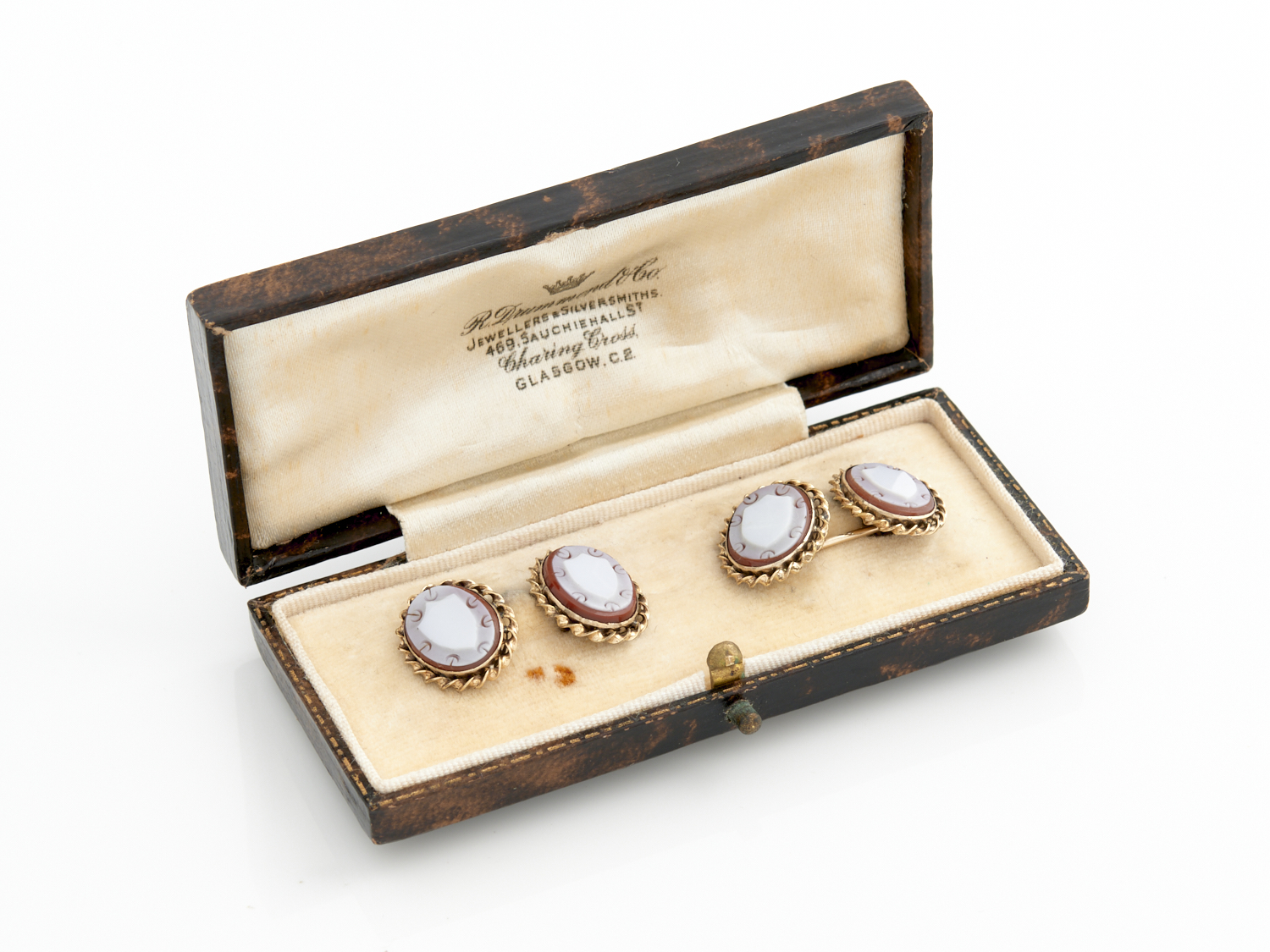 A PAIR OF ANTIQUE AGATE CUFFLINKS IN 9CT GOLD, 5.2GMS, ACCOMPANIED BY A BOX