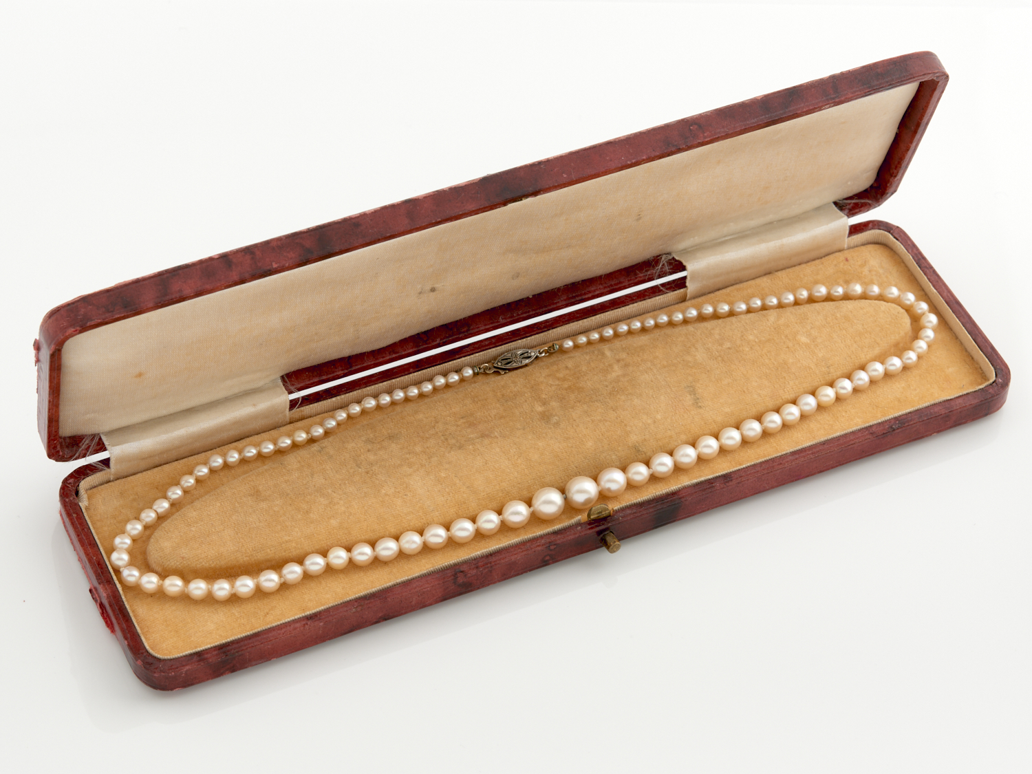 A VINTAGE STRAND OF GRADUATED CULTURED PEARLS TO A DIAMOND SET CLASP IN 9CT GOLD, ACCOMPANIED BY A BOX