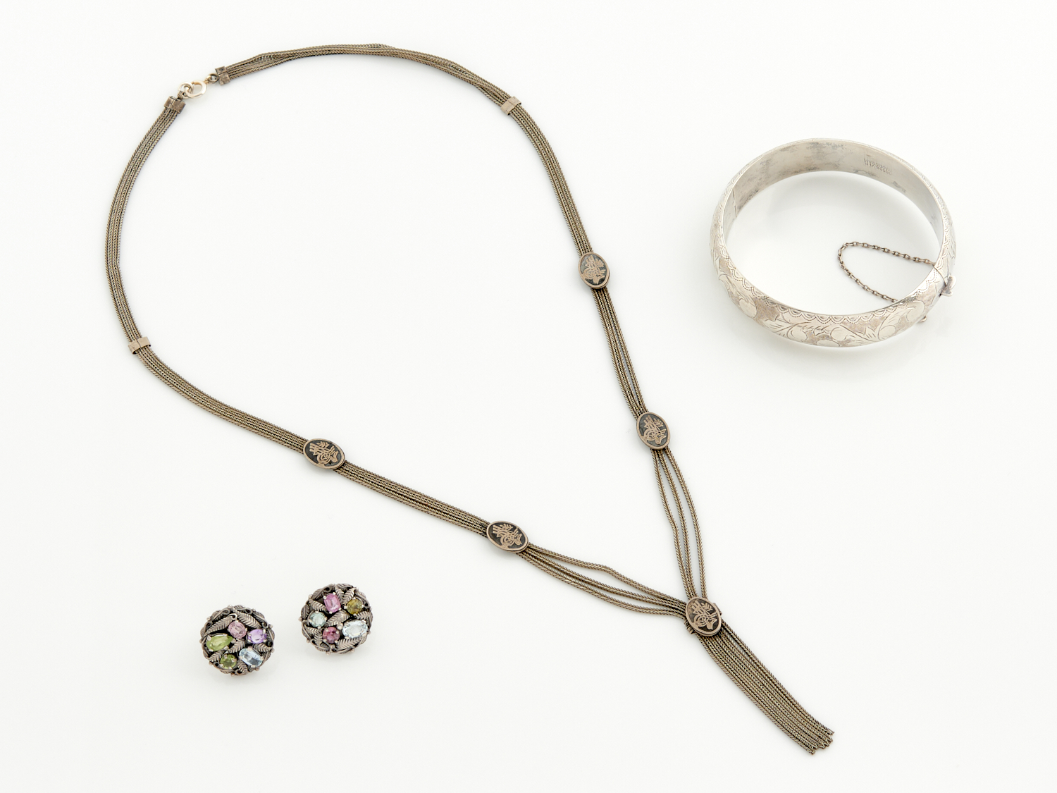 A COLLECTION OF VINTAGE JEWELLERY IN SILVER, COMPRISING A BANGLE, EARRINGS AND NECKLACE