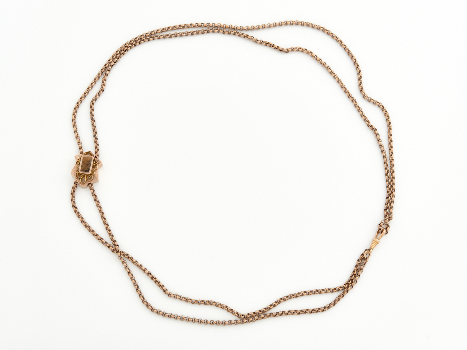 AN ANTIQUE GUARD CHAIN IN ROLLED GOLD TO A SLIDE IN GOLD PLATE, 700MM