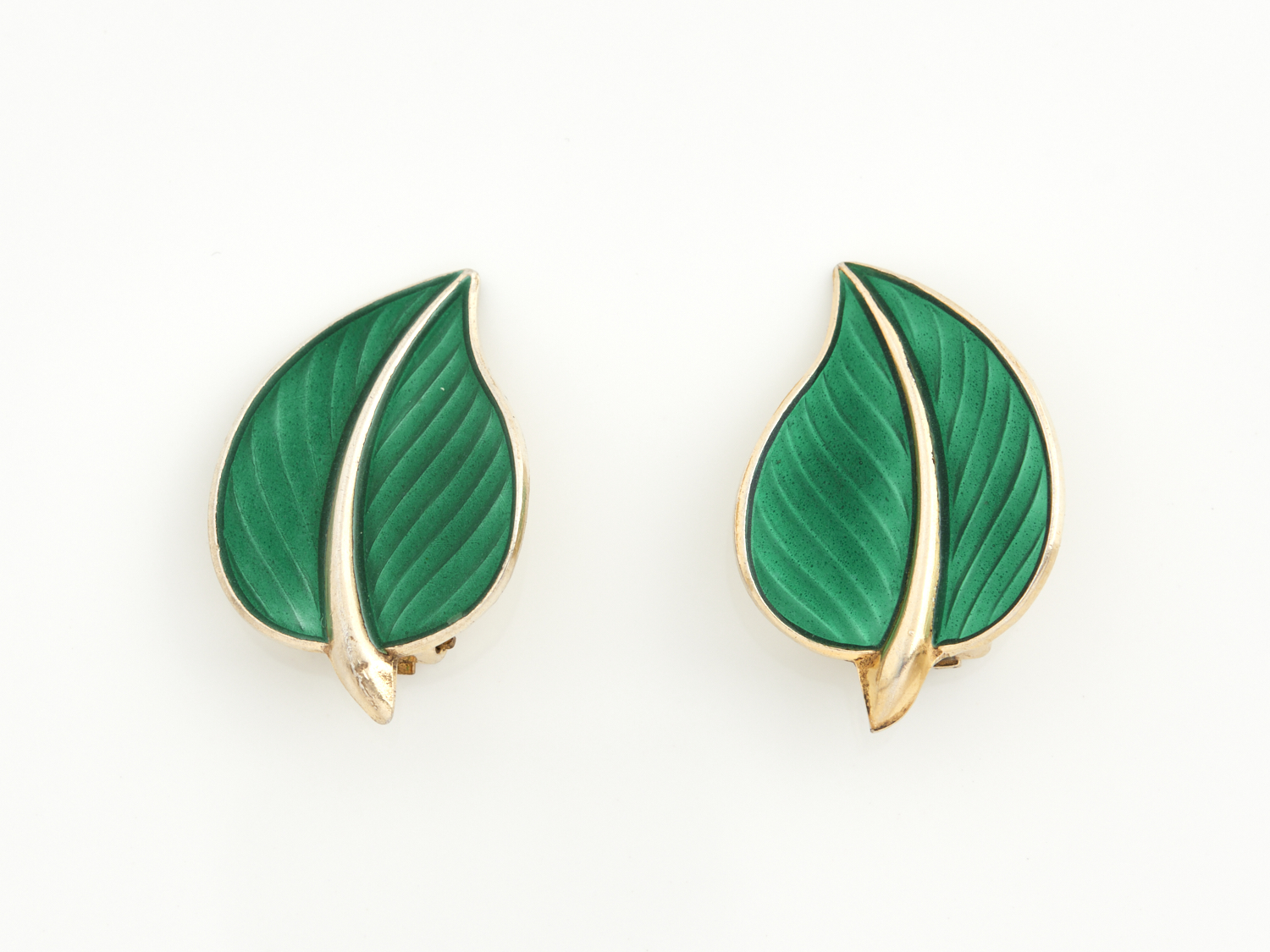A PAIR OF NORWEGIAN ENAMELLED LEAF FORM EARRINGS IN SILVER GILT, TO CLIP ON FITTINGS, 20 X 30MM