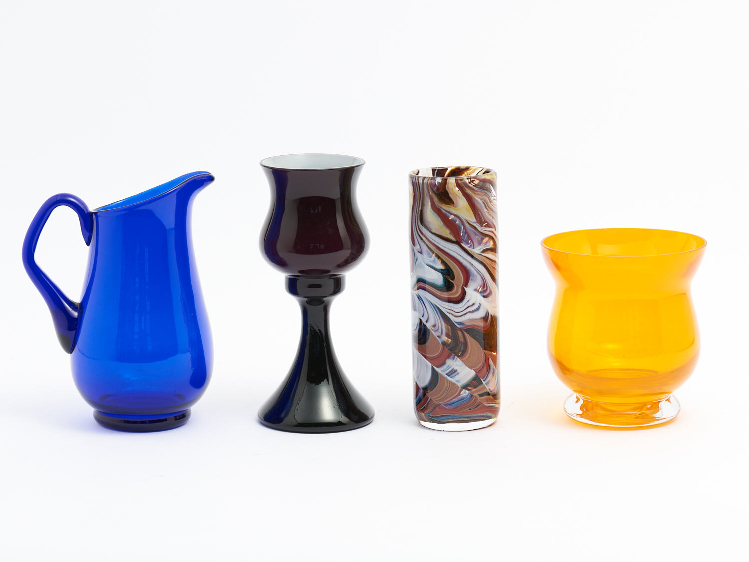 A COLLECTION OF FIVE PIECES OF RETRO ITALIAN GLASSWARE INCLUDING A BLUE JUG, A STEMMED VASE AND A SWIRL PATTERN AND CASED GLASS VASES H.20.5CM (TALLEST), LEONARD JOEL DELIVERY SIZE: LARGE