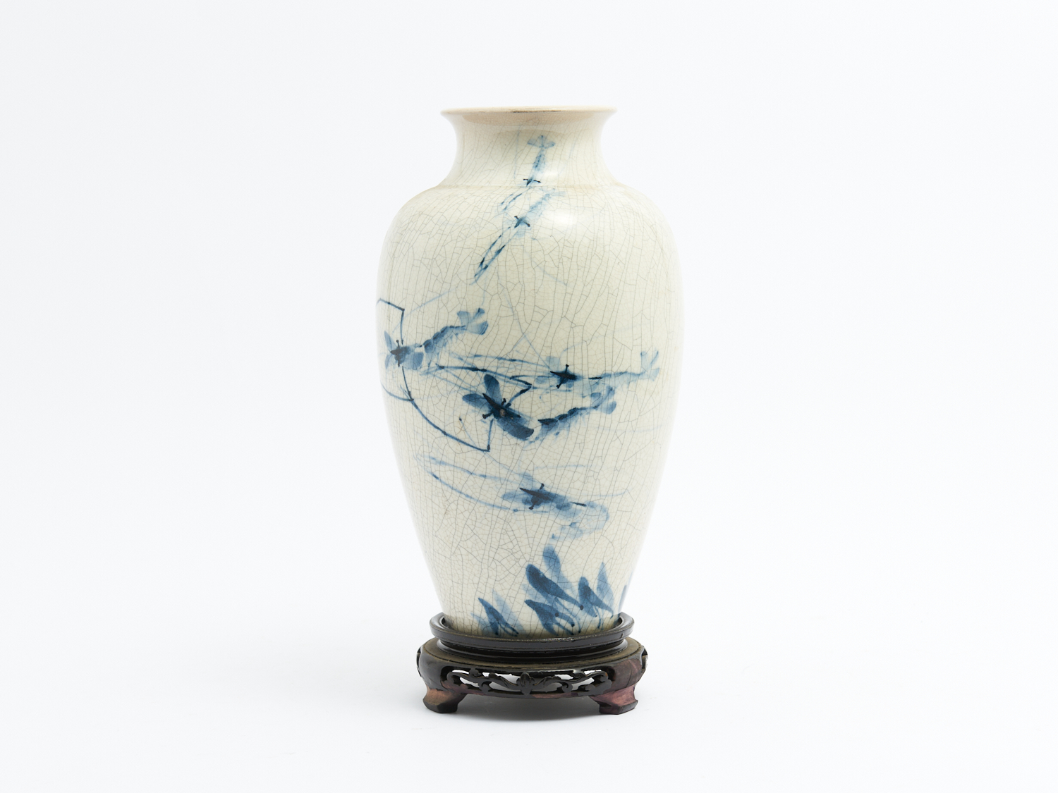 A LARGE CHINESE BLUE AND WHITE GLAZED VASE ON CARVED WOODEN STAND H.35CM, LEONARD JOEL DELIVERY SIZE: LARGE