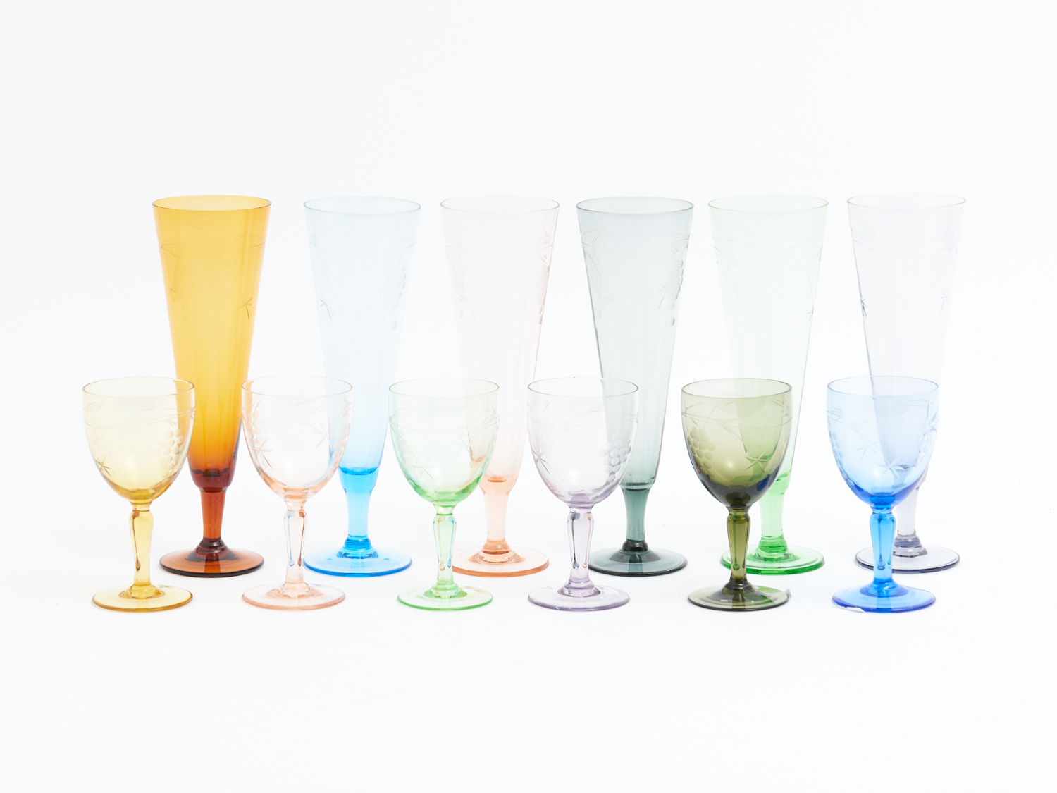 TWO SETS OF SIX RETRO HARLEQUIN COLOURED ENGRAVED CHAMPAGNE STEMS AND MATCHED WINE GLASSES H.20.5CM (TALLEST), LEONARD JOEL DELIVERY SIZE: LARGE