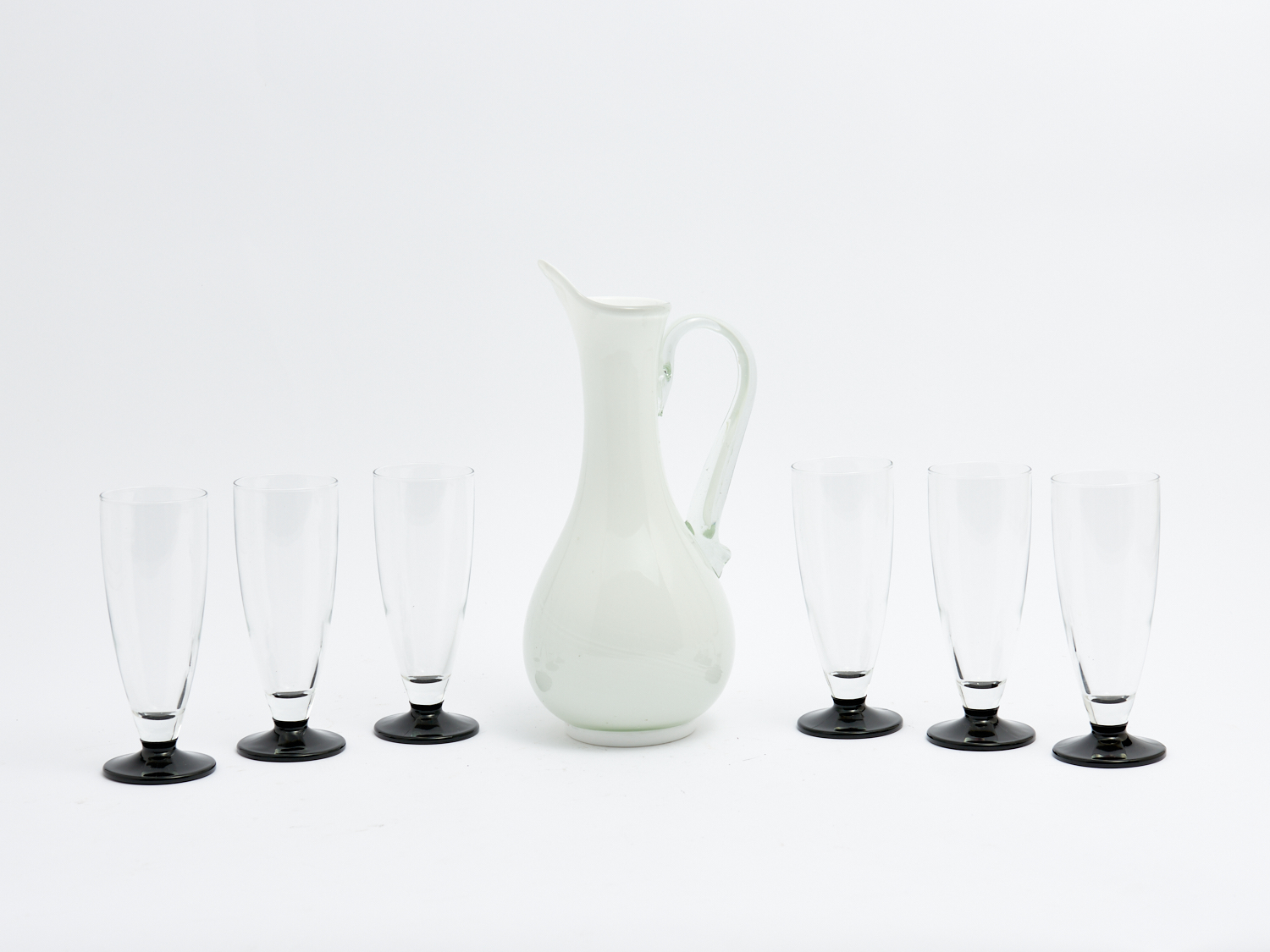 A RETRO SET OF SIX SIGNED ITALIAN BLACK AND CLEAR STEMMED GLASSES AND MATCHED WHITE AND CLEAR JUG H.32CM (JUG), LEONARD JOEL DELIVERY SIZE: LARGE