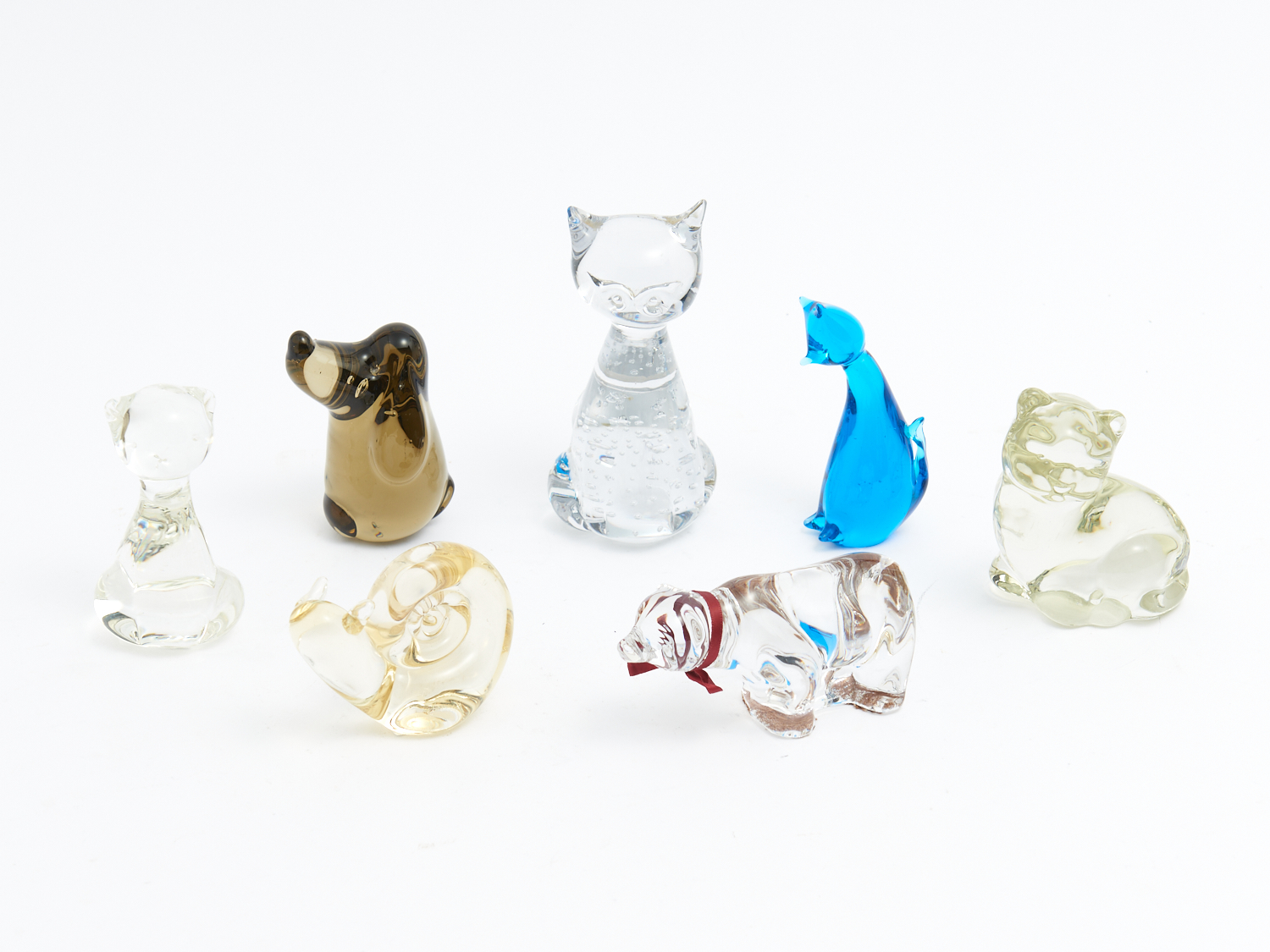 A COLLECTION OF SEVEN VINTAGE SWEDISH AND ITALIAN GLASS ANIMALS SOME SIGNED AND SOME FEATURING CONTROLLED BUBBLES H.14CM (TALLEST), LEONARD JOEL DELIVERY SIZE: MEDIUM