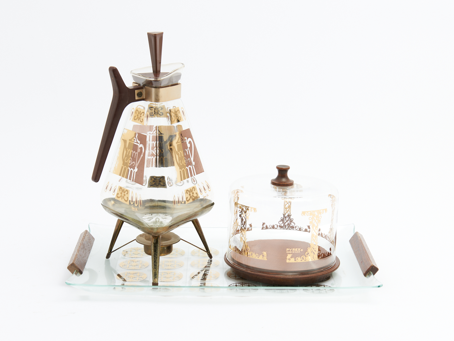 THREE VINTAGE AMERICAN GLASS AND GOLD DECORATED ITEMS INCLUDING COFFEE PERCOLATOR, CAKE COVER AND SERVING TRAY L.41.5CM (TRAY), LEONARD JOEL DELIVERY SIZE: MEDIUM