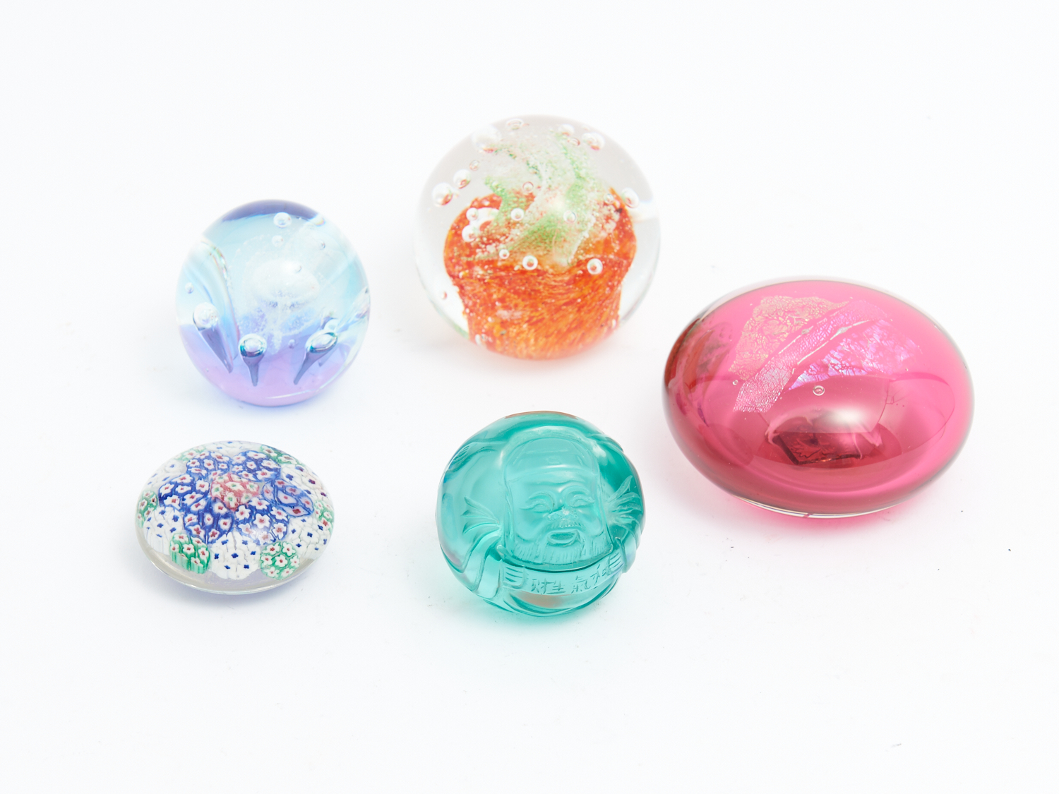A COLLECTION OF FIVE VINTAGE GLASS PAPERWEIGHTS INCLUDING SIGNED AND FIGURAL DIA.9.5CM (LARGEST), LEONARD JOEL DELIVERY SIZE: MEDIUM