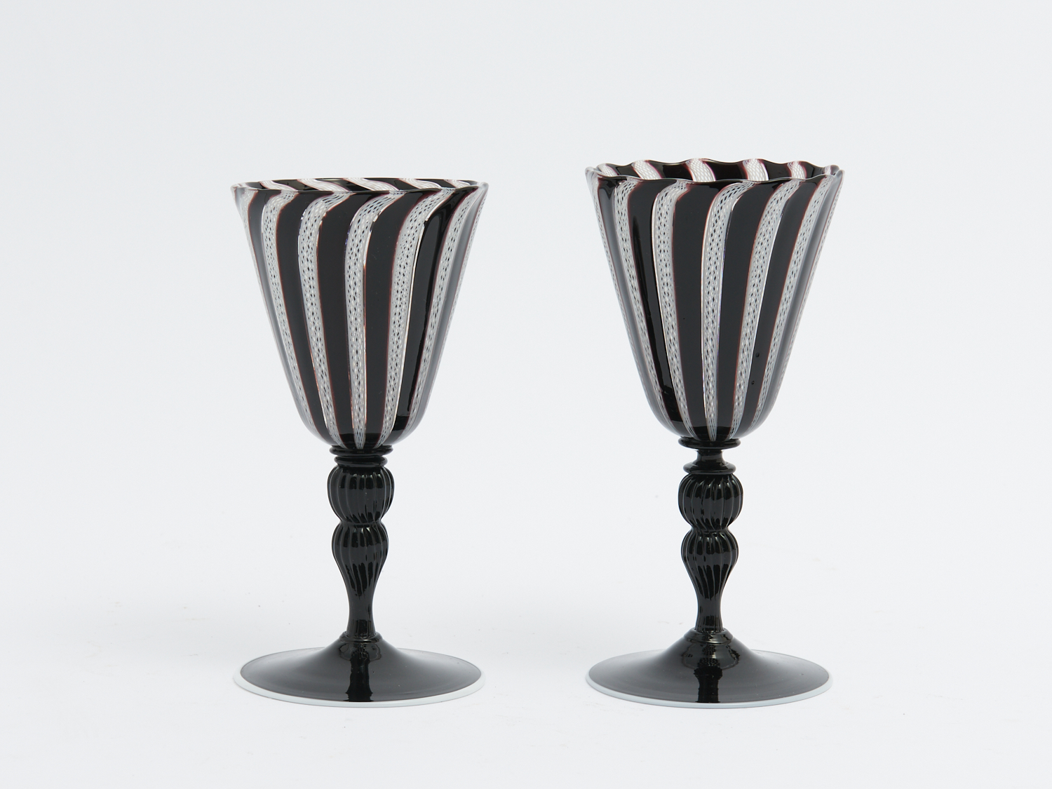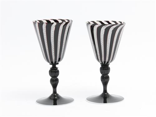 TWO MATCHED LATTICINO MURANO BLACK AND WHITE CONICAL WINE GLASSES H.16CM (TALLEST), LEONARD JOEL DELIVERY SIZE: SMALL