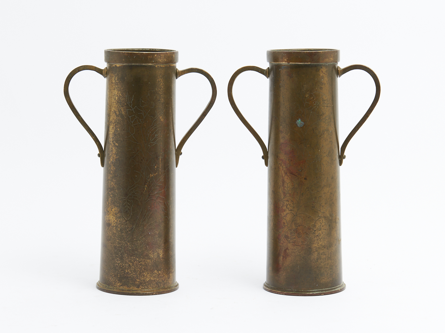 A PAIR OF FIRST WORLD WAR TRENCH ART ENGRAVED SHELL VASES, SIGNED AND DATED 1918 H.29.5CM, LEONARD JOEL DELIVERY SIZE: MEDIUM