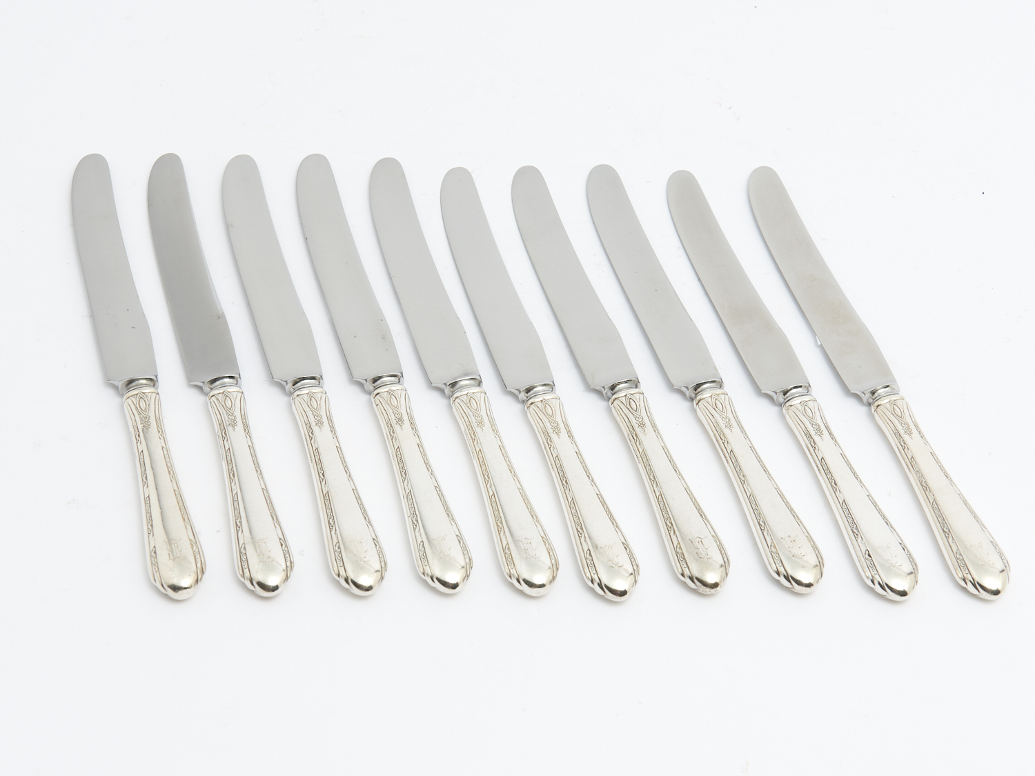 A SET OF TEN HALLMARKED STERLING SILVER STAINLESS STEEL BLADED KNIVES DATED 1928 L.24.5CM, LEONARD JOEL DELIVERY SIZE: SMALL