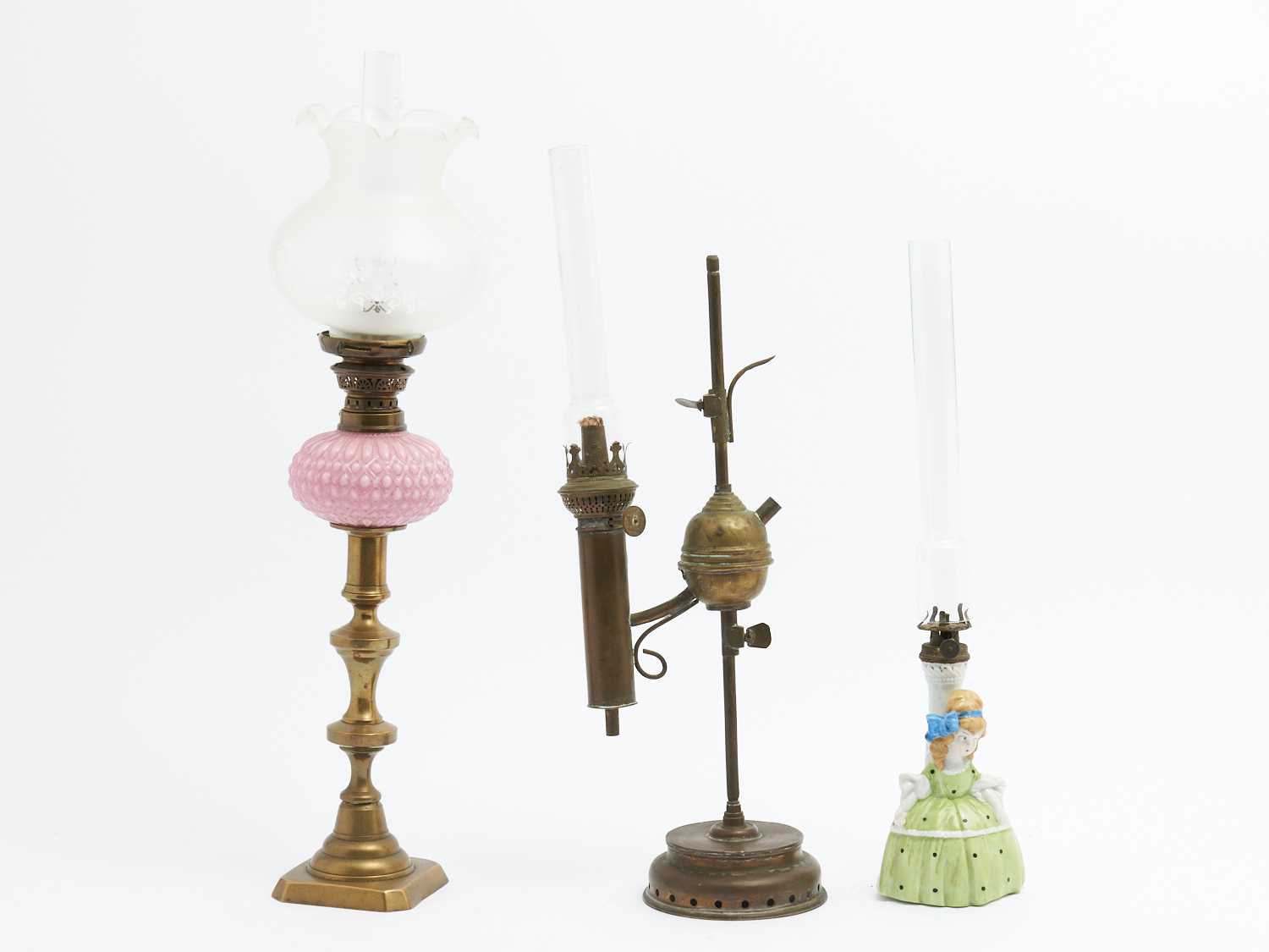 A GROUP OF THREE 19TH CENTURY KEROSENE LAMPS INCLUDING A BRASS LIBRARY LAMP GERMAN FIGURAL AND PINK SATIN GLASS H.51CM (TALLEST), LEONARD JOEL DELIVERY SIZE: LARGE