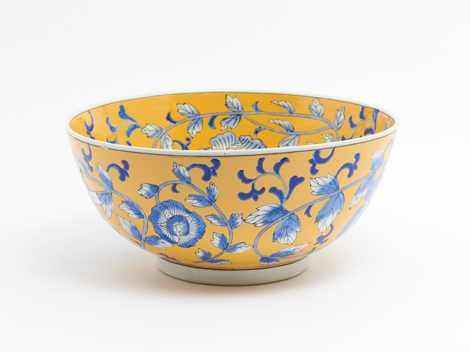 A LARGE SIGNED CHINESE YELLOW AND BLUE BOWL DIA.31CM, LEONARD JOEL DELIVERY SIZE: LARGE