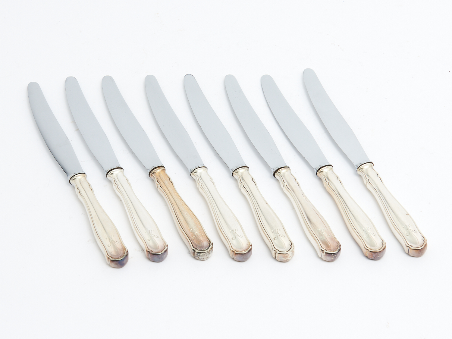 A SET OF EIGHT 1900S GERMAN 800 SILVER HANDLED DINNER KNIVES L.25CM, LEONARD JOEL DELIVERY SIZE: SMALL