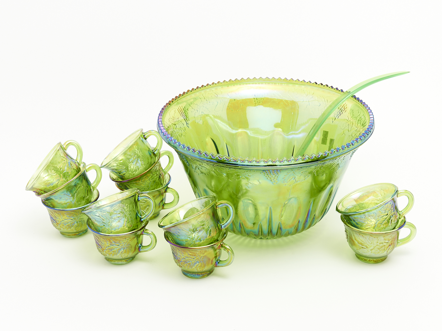A VINTAGE GREEN IRIDESCENT CARNIVAL GLASS PUNCH SET WITH LADLE DIA.31.5CM (BOWL), LEONARD JOEL DELIVERY SIZE: LARGE