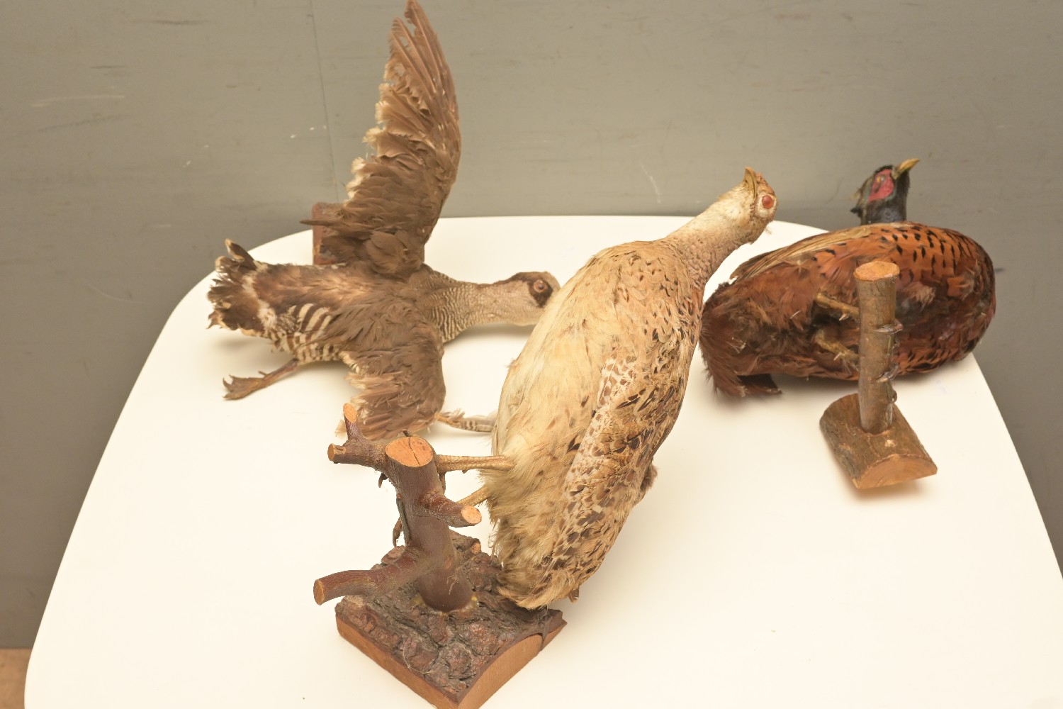 A COLLECTION OF THREE VINTAGE TAXIDERMY BIRDS INCLUDING PHEASANT AND DUCK (A/F) (LEONARD JOEL DELIVERY SIZE: LARGE)