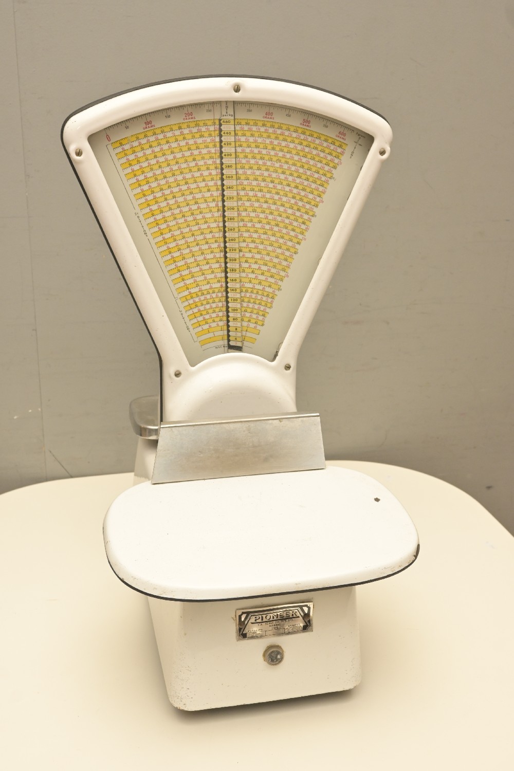 AN ANTIQUE SET OF ENAMEL AND STEEL GROCERY SCALES (A/F) (64H X 32W X 48D CM) (LEONARD JOEL DELIVERY SIZE: X-LARGE)