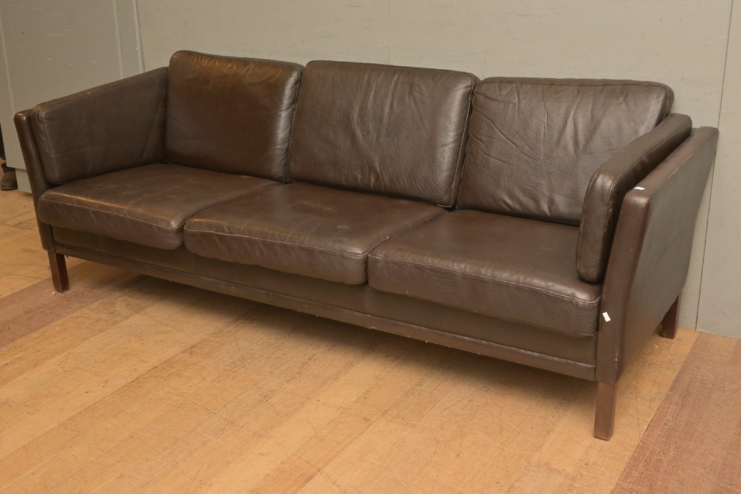 A DEEP BROWN DANISH LEATHER THREE SEATER SOFA (81H X 218W X 80D CM) (PLEASE NOTE THIS HEAVY ITEM MUST BE REMOVED BY CARRIERS AT THE CUSTOMER'S EXPENSE. LEONARD JOEL STAFF CANNOT ASSIST CARRYING THIS ITEM) (X-LARGE ITEM)