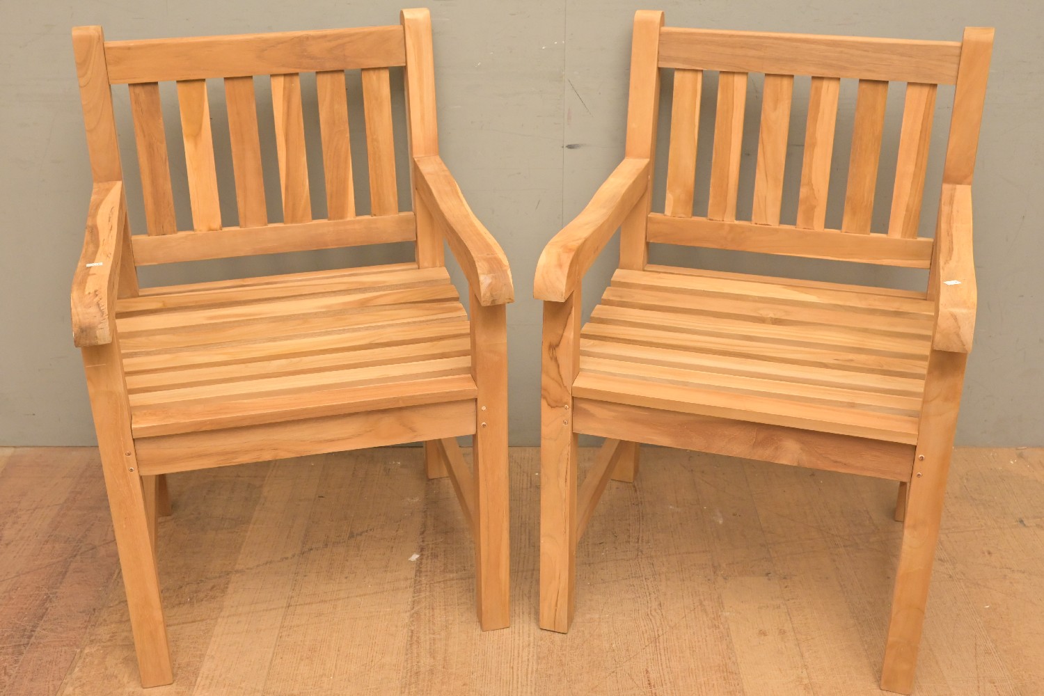 A PAIR OF TEAK CARVER CHAIRS (92H X 60W X 66D CM) (LEONARD JOEL DELIVERY SIZE: X-LARGE)