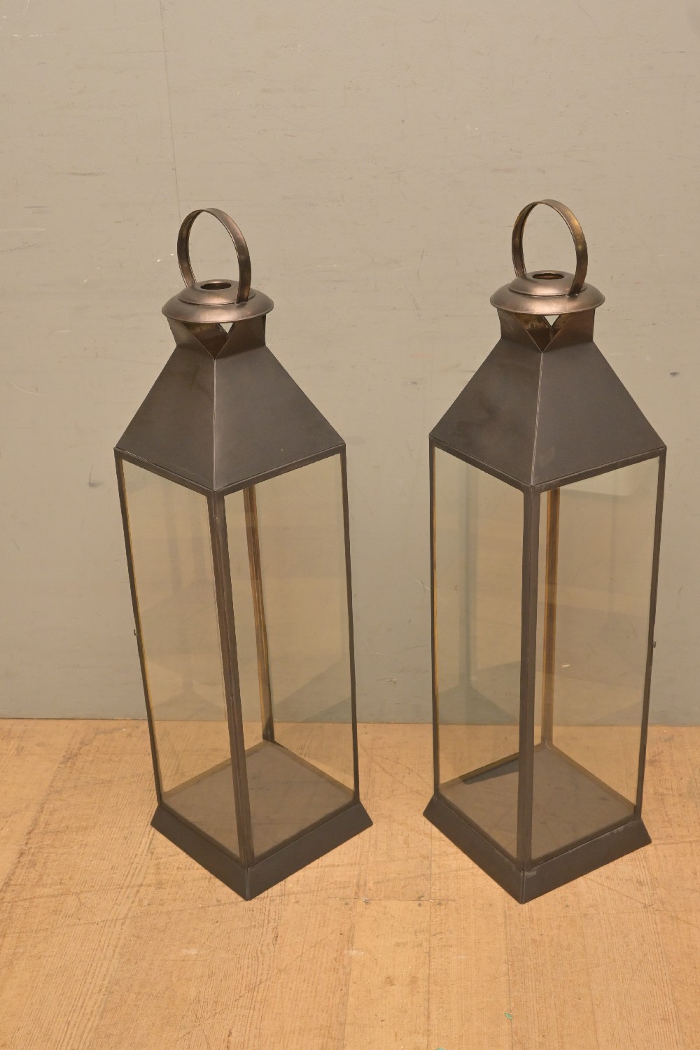 A PAIR OF TALL BRASS LANTERNS (100H X 26W X 26D CM) (LEONARD JOEL DELIVERY SIZE: LARGE)
