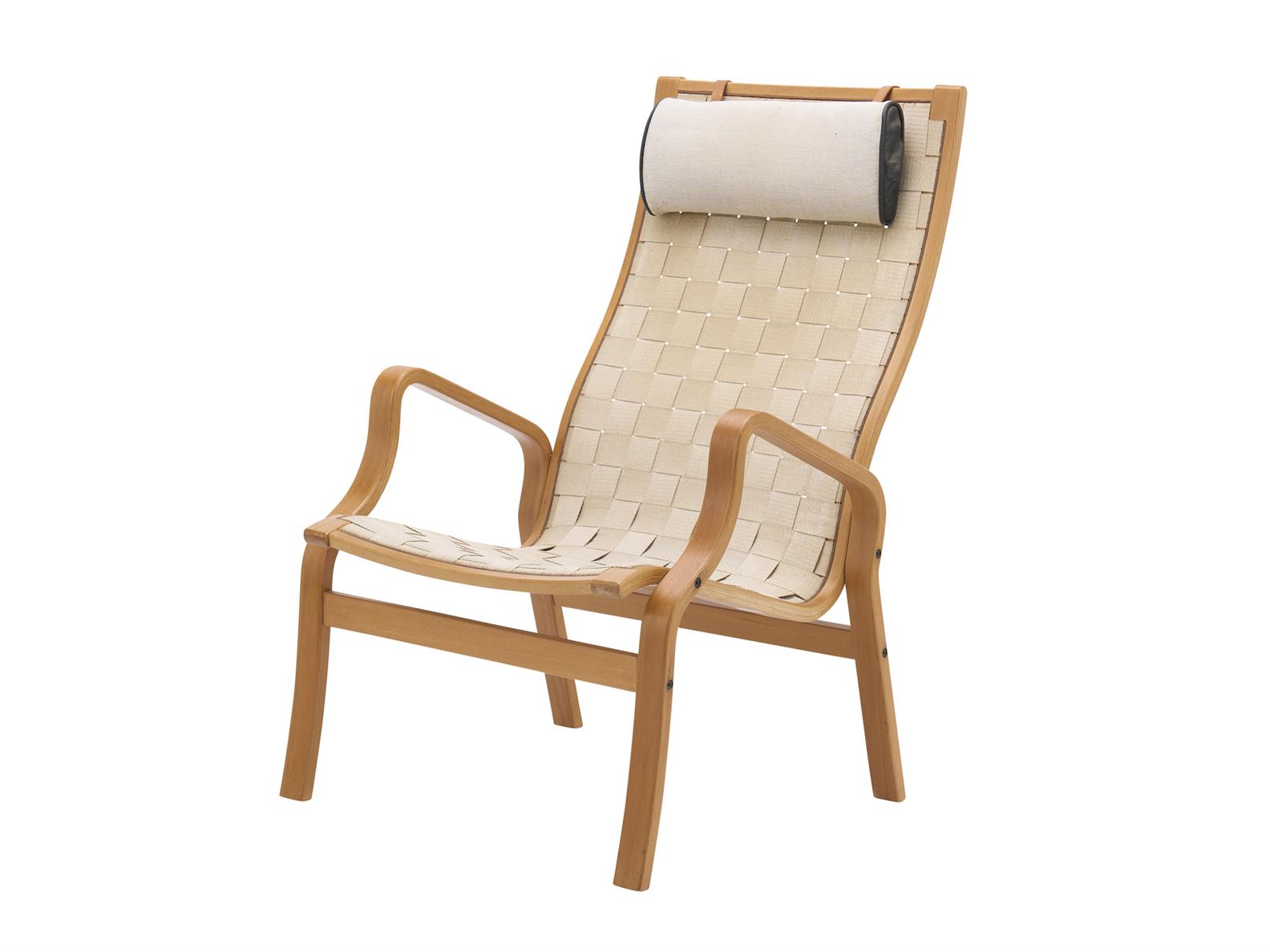 Beech bentwood frame with webbing and leather straps. Headrest cushion.