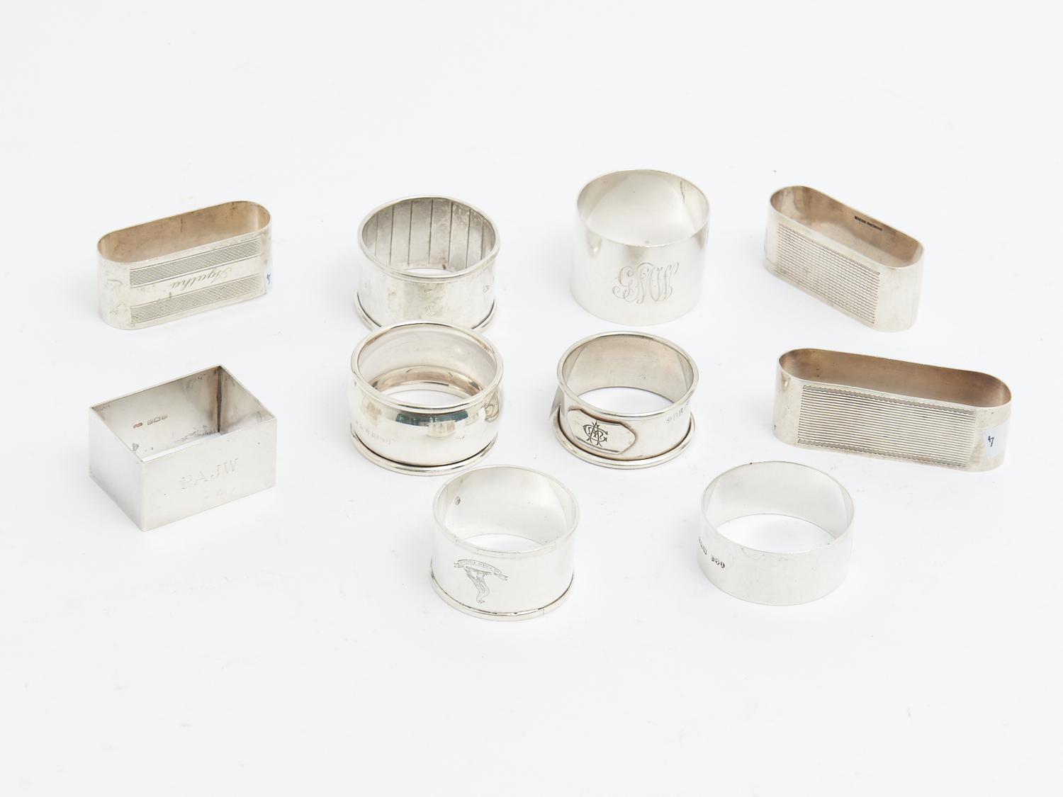 NINE STERLING SILVER SERVIETTE RINGS 240G W.7.2CM (WIDEST), LEONARD JOEL DELIVERY SIZE: SMALL