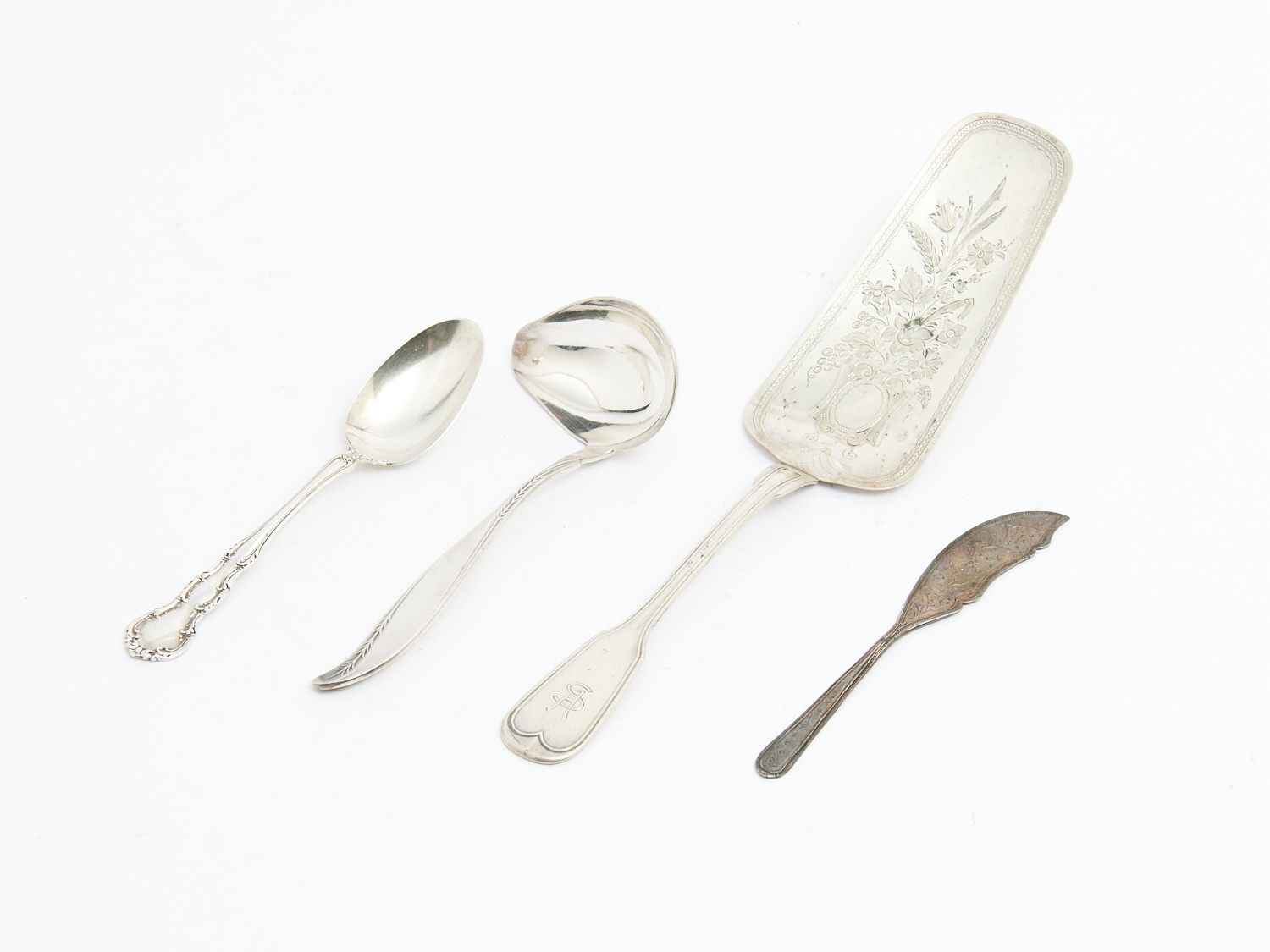 A COLLECTION OF SILVER ITEMS INCL. A CAKE SERVER, TEASPOON, BUTTER KNIFE AND SMALL LADLE 156G L.27CM (CAKE SERVER), LEONARD JOEL DELIVERY SIZE: SMALL
