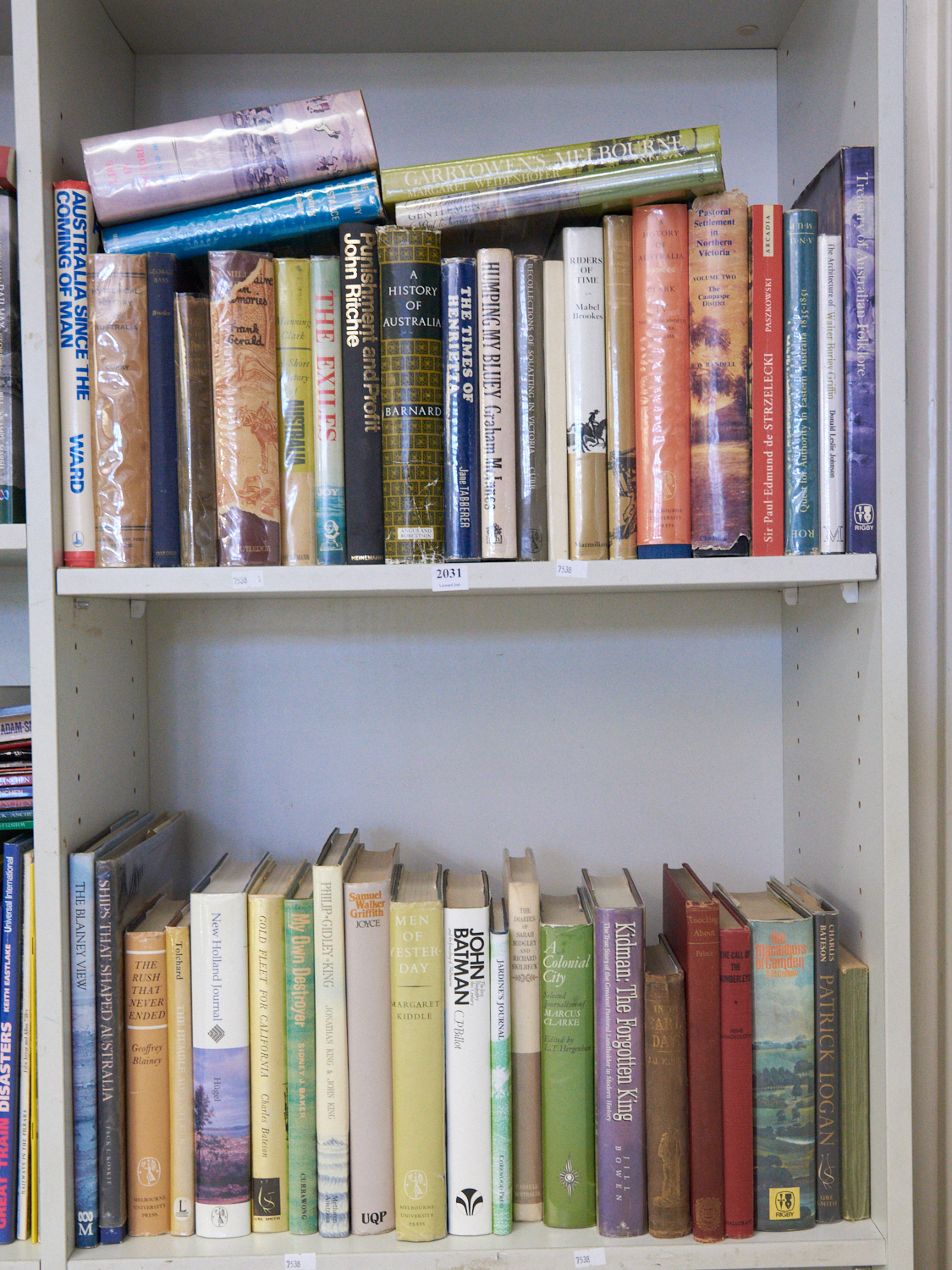 A SHELF OF BOOKS ON AUSTRALIAN COLONIAL HISTORY INCLUDING HYSTERICAL HISTORY OF AUSTRALIA, HUMPING MY BLUEY, AND AUSTRALIA SINCE THE COMING OF MAN, LEONARD JOEL DELIVERY SIZE: LARGE