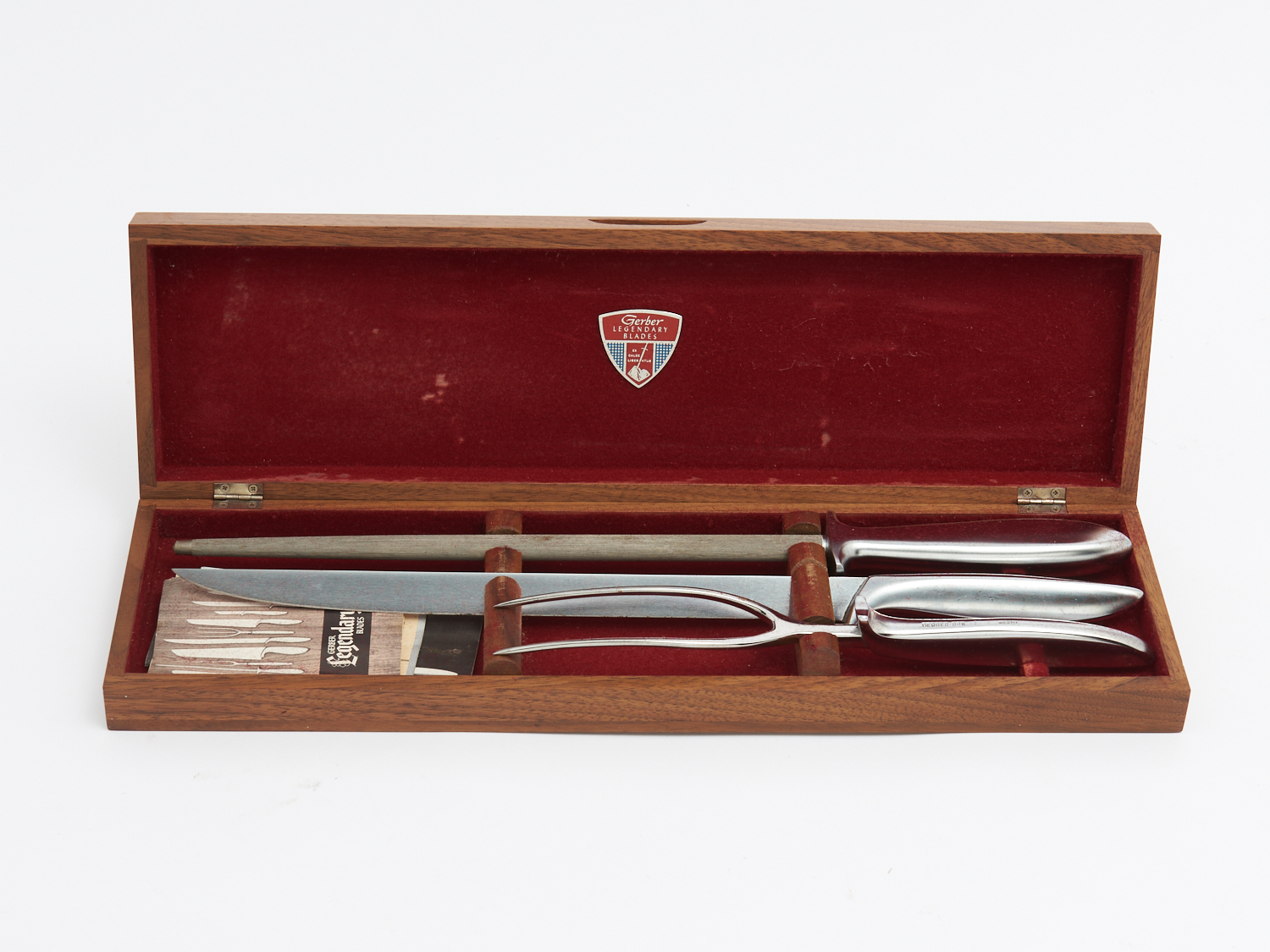 A 1960s GERBER CARVING SET INCLUDING KNIFE, SHARPENING STEEL,AND FORK IN A WALNUT CASE L.46CM, LEONARD JOEL DELIVERY SIZE: MEDIUM