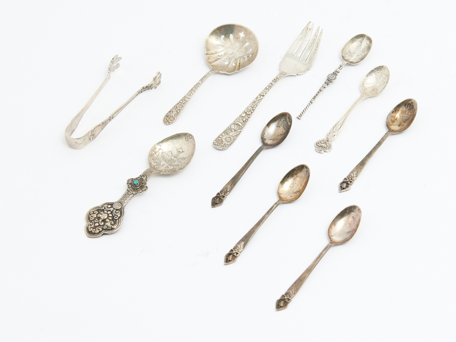A COLLECTION OF STERLING SILVER CUTLERY INCLUDING AND A PAIR OF TONGS 142G L.15CM, LEONARD JOEL DELIVERY SIZE: SMALL