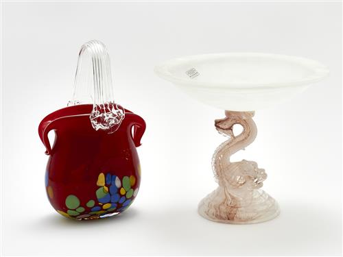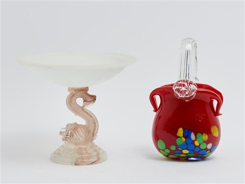 TWO PIECES OF ITALIAN ART GLASS INCLUDING A MURANO DOLPHIN PEDESTAL CENTER BOWL AND A HANDBAG VASE H.26.5CM (TALLEST), LEONARD JOEL DELIVERY SIZE: MEDIUM