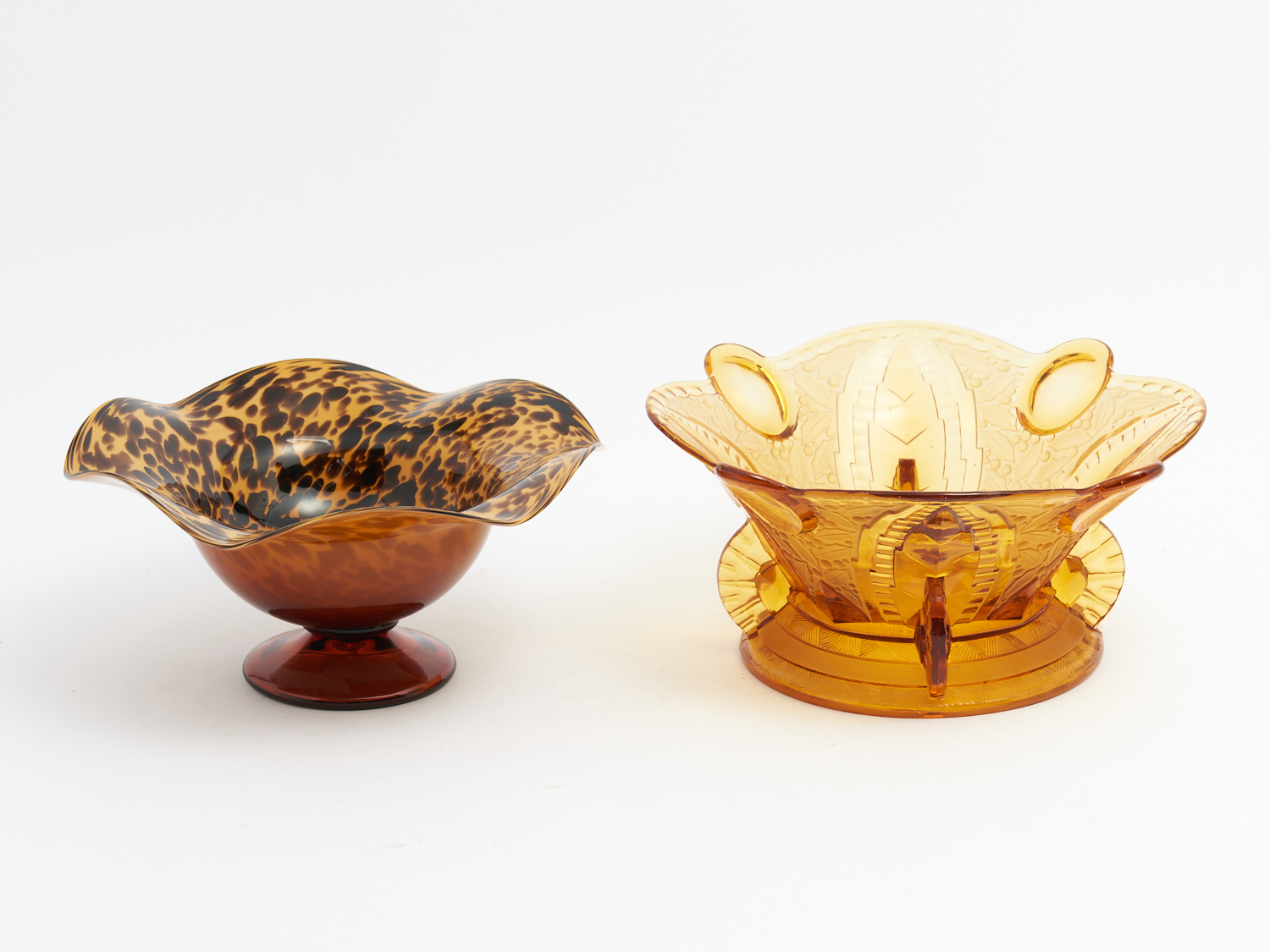 TWO AMBER GLASS CENTER BOWLS INCLUDING ART DECO DIA.28CM, LEONARD JOEL DELIVERY SIZE: MEDIUM