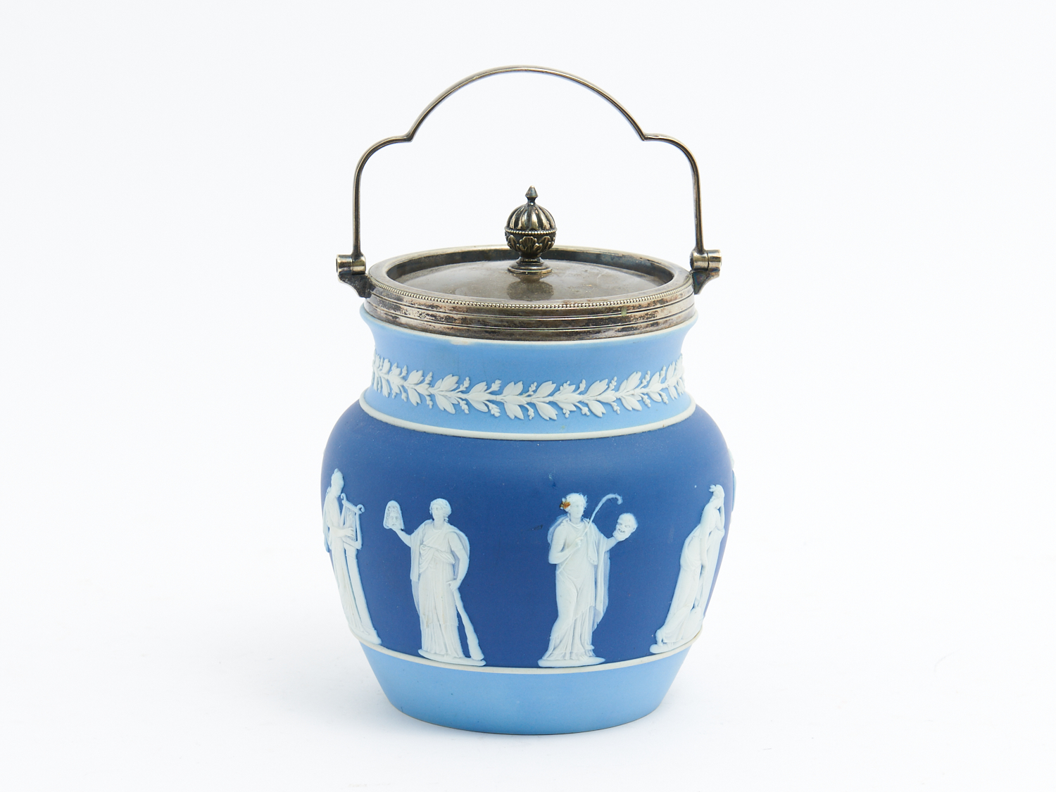 A WEDGWOOD JASPERWARE SILVER PLATE MOUNTED BISCUIT BARREL H.22CM, LEONARD JOEL DELIVERY SIZE: SMALL