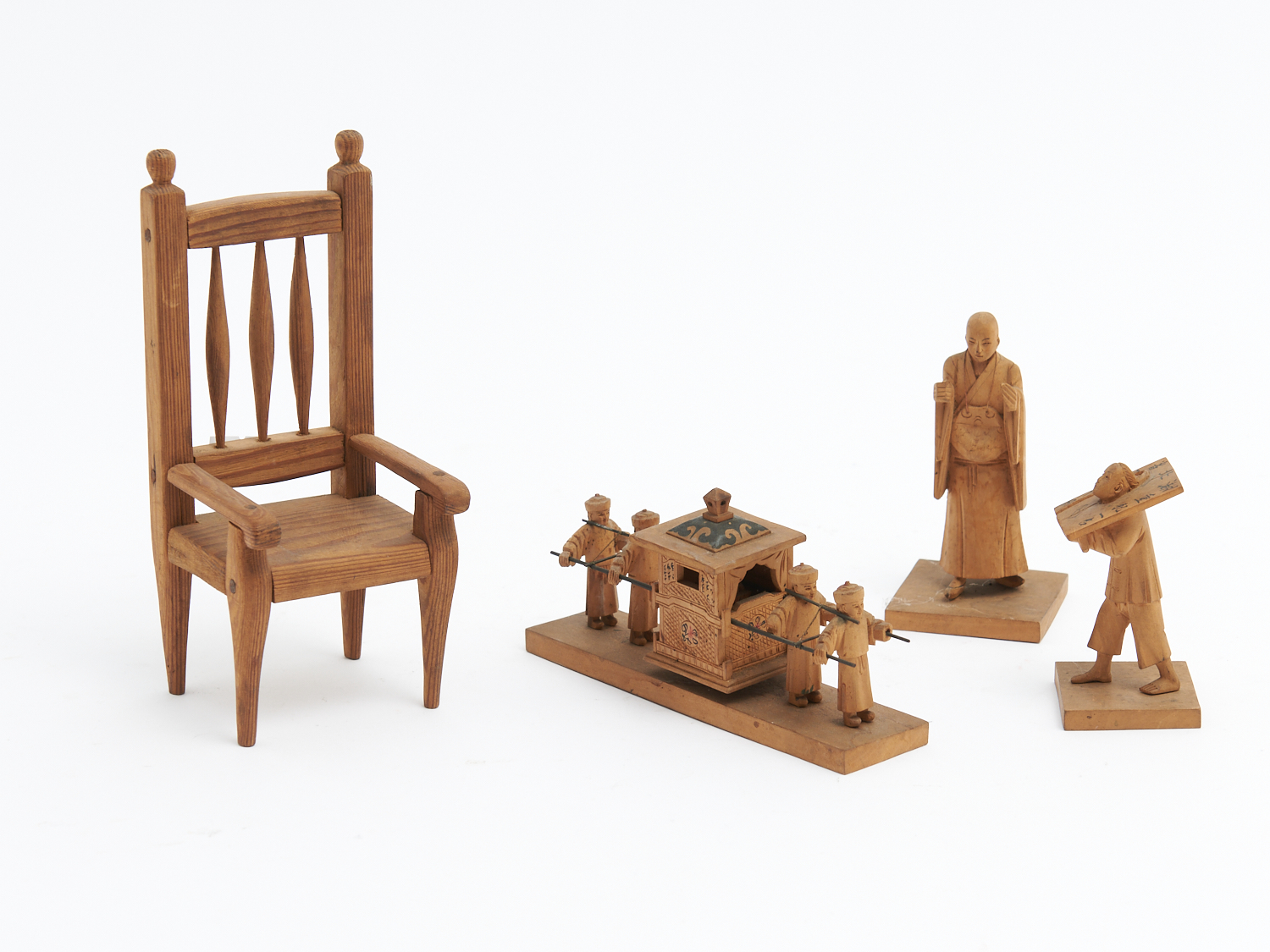 A GROUP OF CARVED WOODEN CHINESE MINIATURE FIGURES INCLUDING A CHAIR H.17CM (CHAIR), LEONARD JOEL DELIVERY SIZE: SMALL