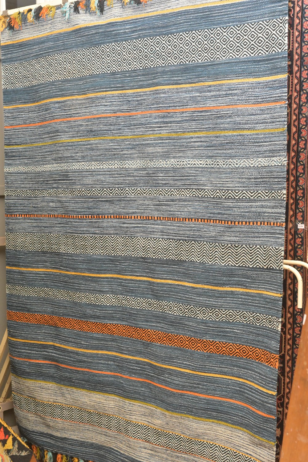 A LARGE COLOURFUL, DENSELY HAND- WOVEN RAJASTHANI KILIM RUG. MADE FROM THE FINEST COTTON FLEECE. IN BLUE TONES. SIZE: 160 X 230 CM-ORIGIN: JAIPUR – RRP: $1,100