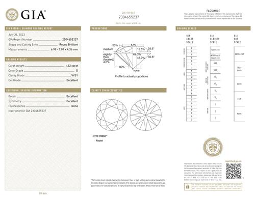 a facsimile GIA report numbered 2304655237, dated 31 July 2023, stating that the 1.32 carat diamond is natural, D colour, VVS1 clarity, laser inscribed;