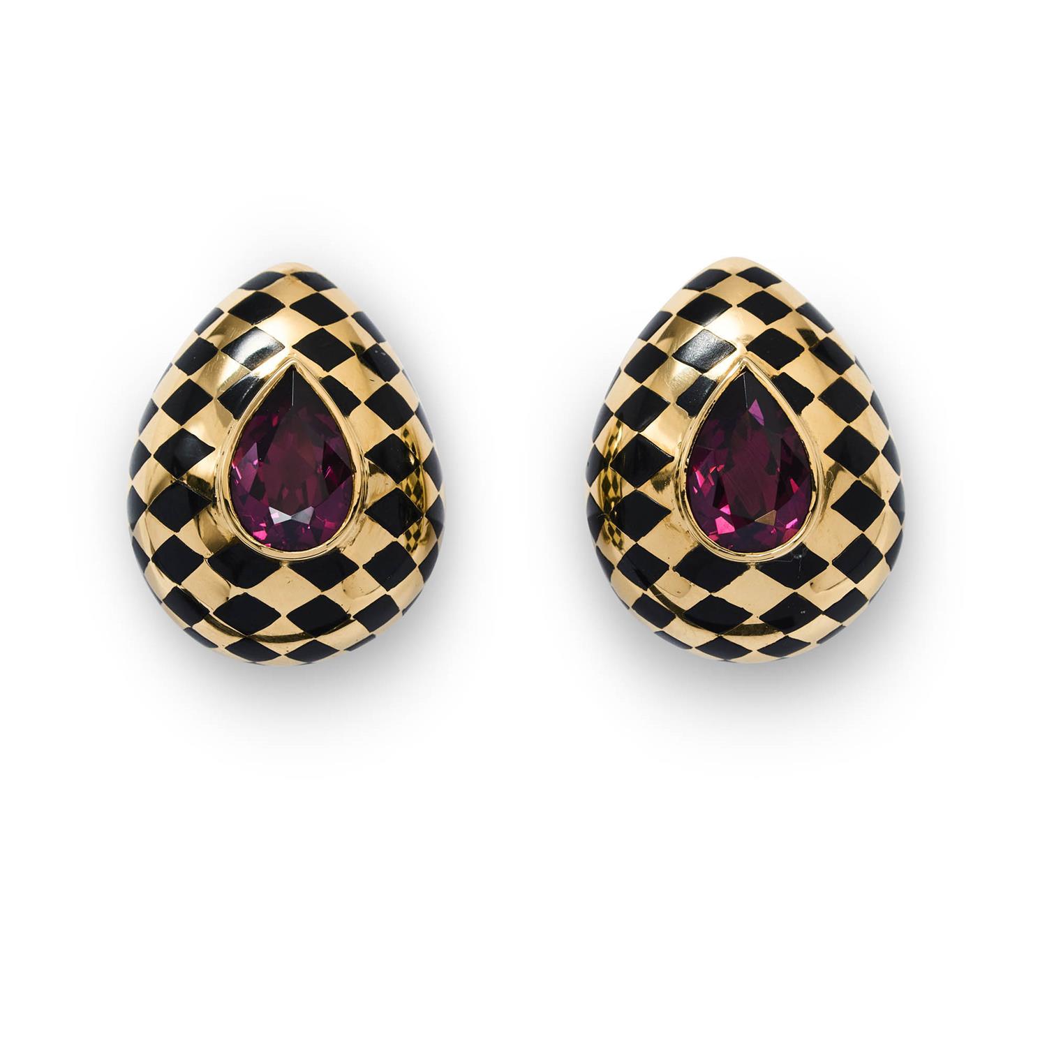 ANGELA CUMMINGS PAIR OF 18CT GOLD TOURMALINE AND BLACK JADE CLIP EARRINGS, CIRCA 1984