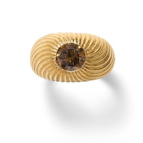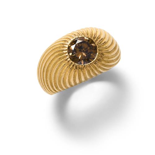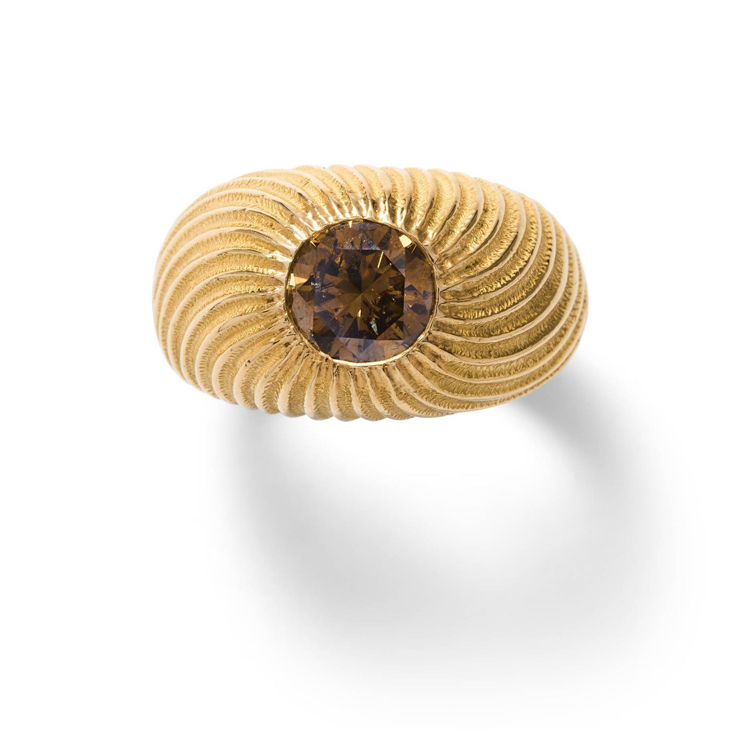 Of bombé form continuously decorated in a textured swirl design centring a collet-set brilliant-cut champange diamond weighing approximately 2.34 carats, size Q, signed Schlumberger Studios, Tiffany & Co.