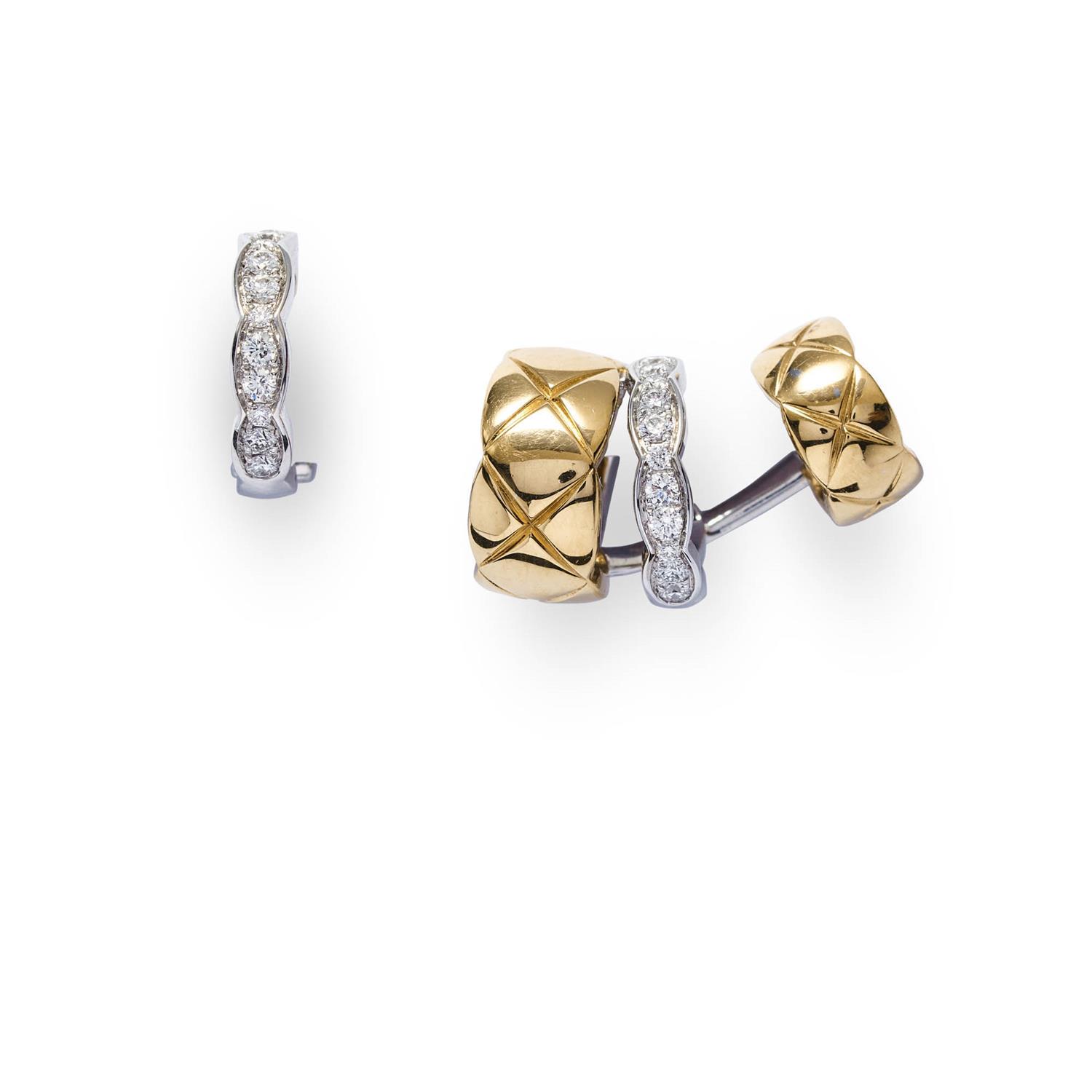 Each hoop of quilted motif, partially decorated with brilliant-cut diamonds, the diamonds together weighing approximately 0.24 carats, mounted in 18ct two-tone gold, post and clip fittings, posts removable, makers marks, signed Chanel