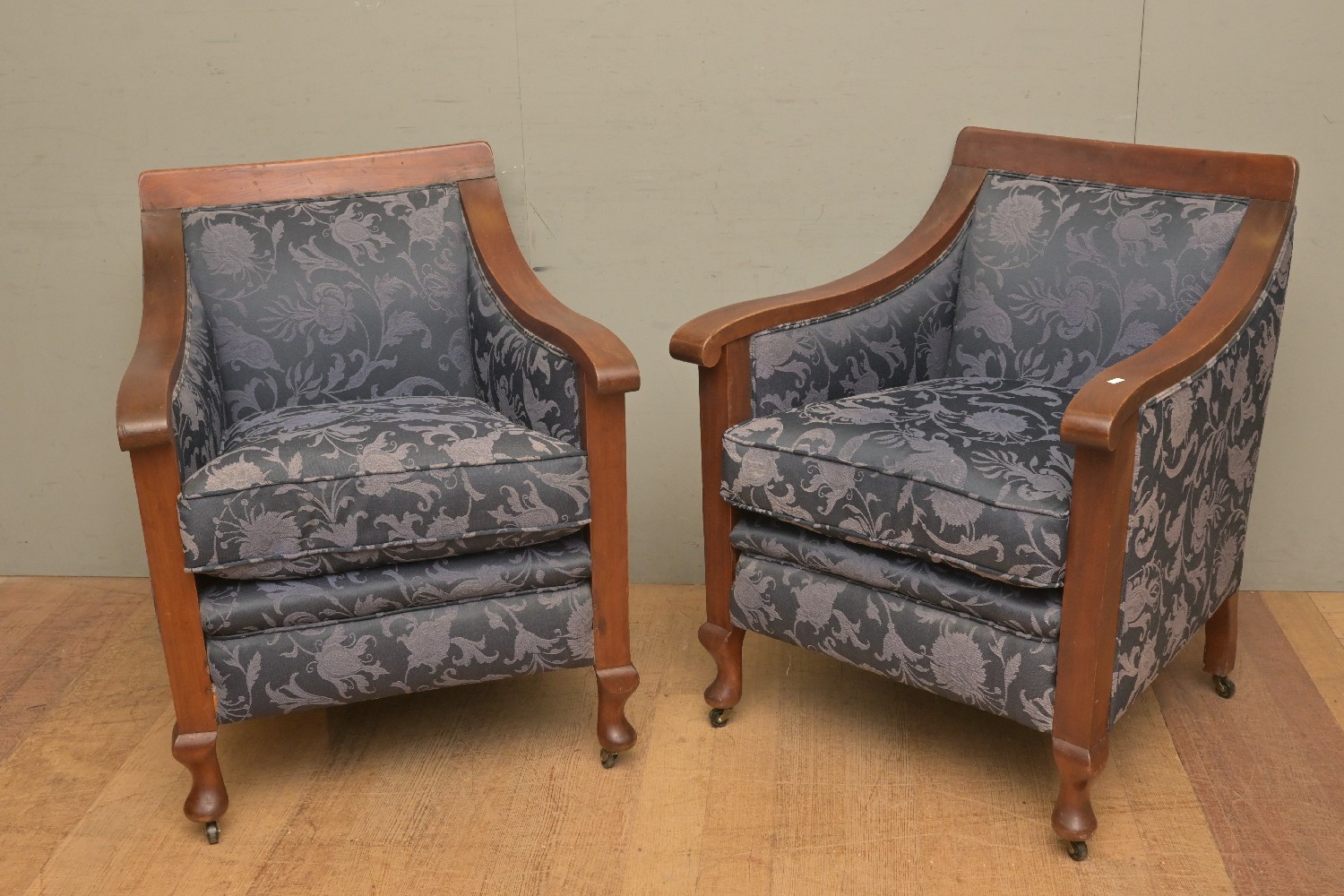 A PAIR OF SUBSTANTIAL 1920'S BLACKWOOD & UPHOLSTERED ARMCHAIRS FOR FOY AND GIBSON, MELBOURNE (A/F) (89H X 70W X82D CM) (PLEASE NOTE THIS HEAVY ITEM MUST BE REMOVED BY CARRIERS AT THE CUSTOMER'S EXPENSE. LEONARD JOEL STAFF CANNOT ASSIST CARRYING THIS ITEM) (LARGE ITEM)