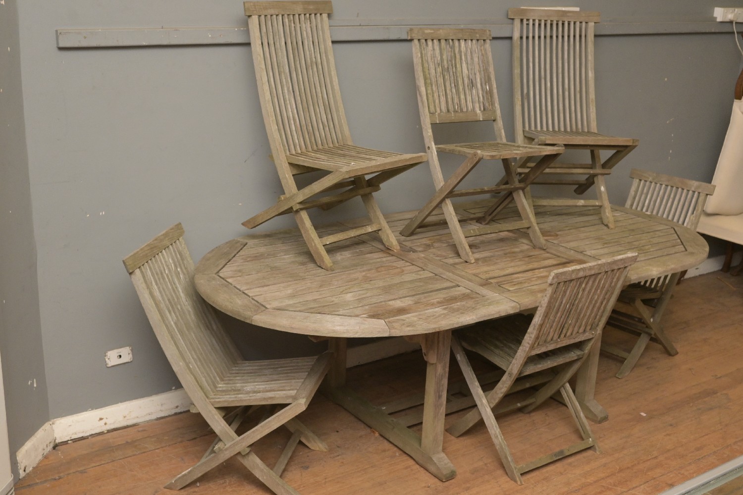 A TEAK SEVEN PIECE OUTDOOR DINING SETTING BY TURENDAB GARDEN (A/F) (74H X 237W X 119D CM) (PLEASE NOTE THIS HEAVY ITEM MUST BE REMOVED BY CARRIERS AT THE CUSTOMER'S EXPENSE. LEONARD JOEL STAFF CANNOT ASSIST CARRYING THIS ITEM) (LARGE ITEM)