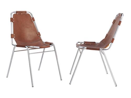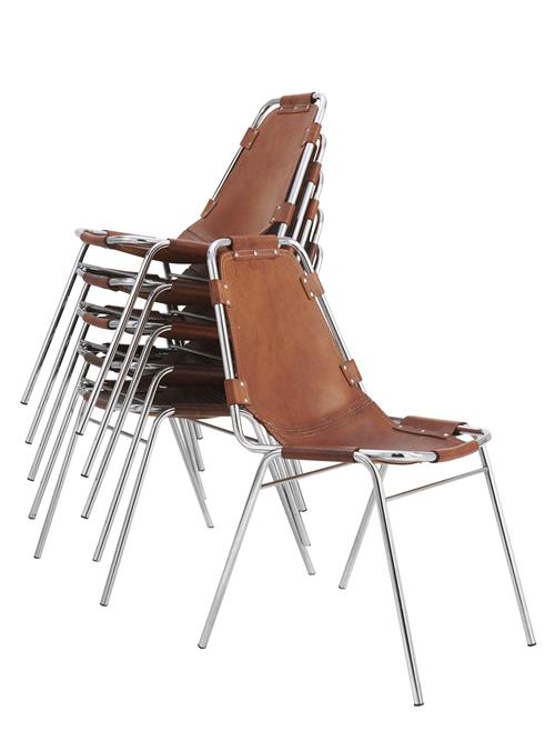 Chromed metal frames with tan leather saddle seating. Feet caps. Stackable.
