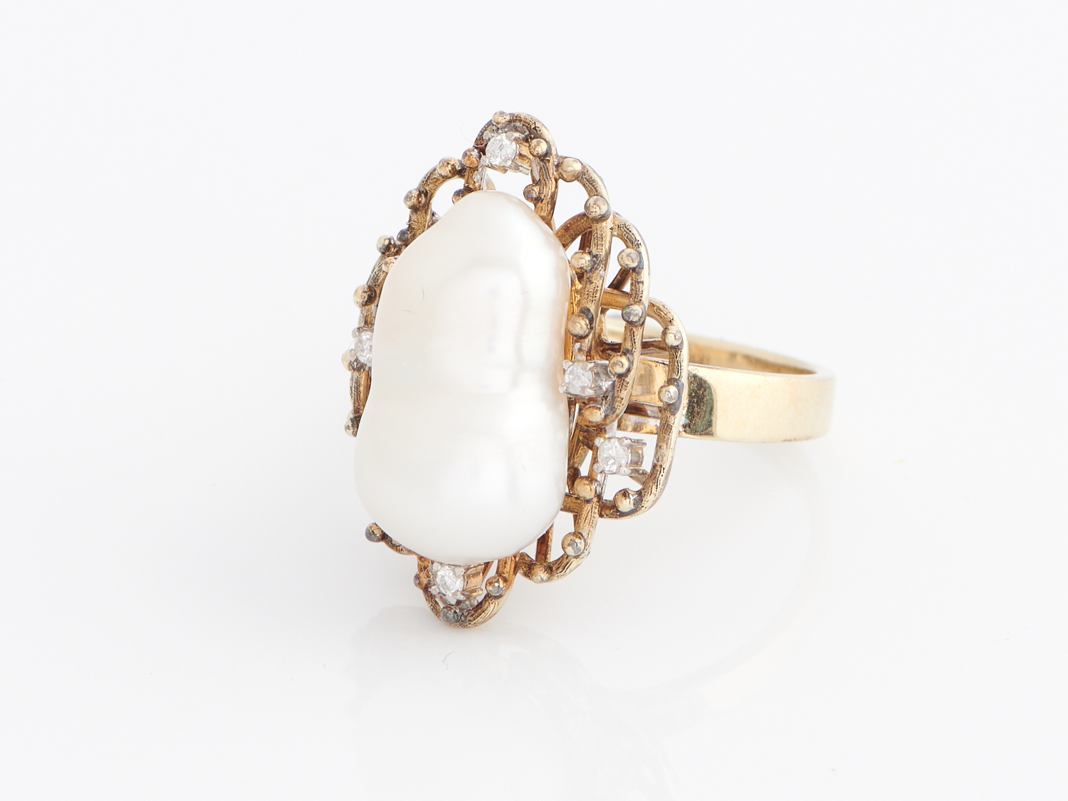 A PEARL AND DIAMOND RING IN 14CT GOLD, SIZE N, 6.8GMS