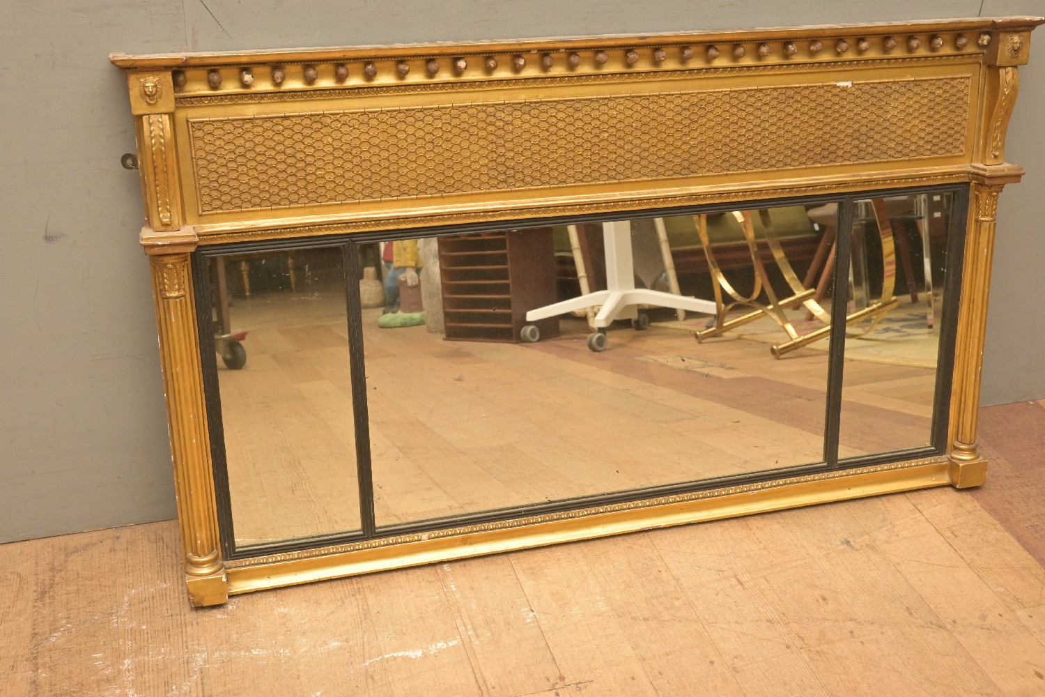 A GILT AND EBONISED OVERMANTEL MIRROR (72H X 126W CM) (LEONARD JOEL DELIVERY SIZE: X-LARGE)