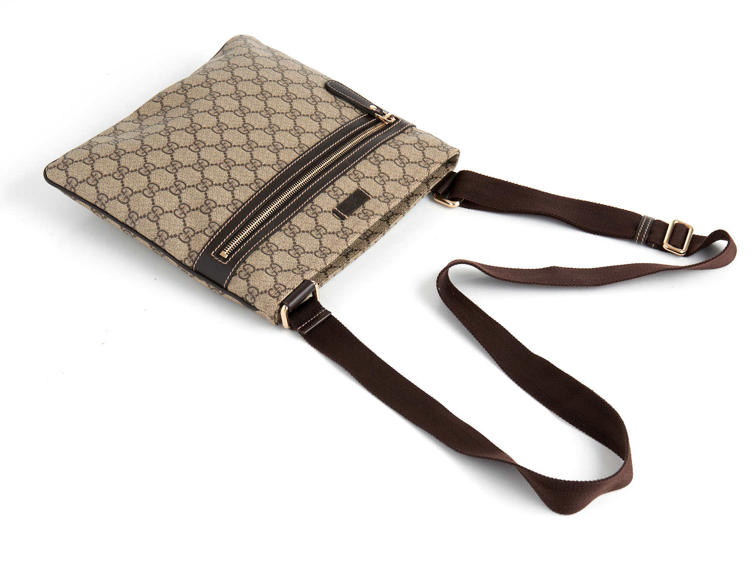 GUCCI, A CROSSBODY BAG STYLED IN GG WEB COATED CANVAS WITH BROWN LEATHER TRIM AND CONFORMING GROSGRAIN SHOULDER STRAP, 25.5 X 28CM